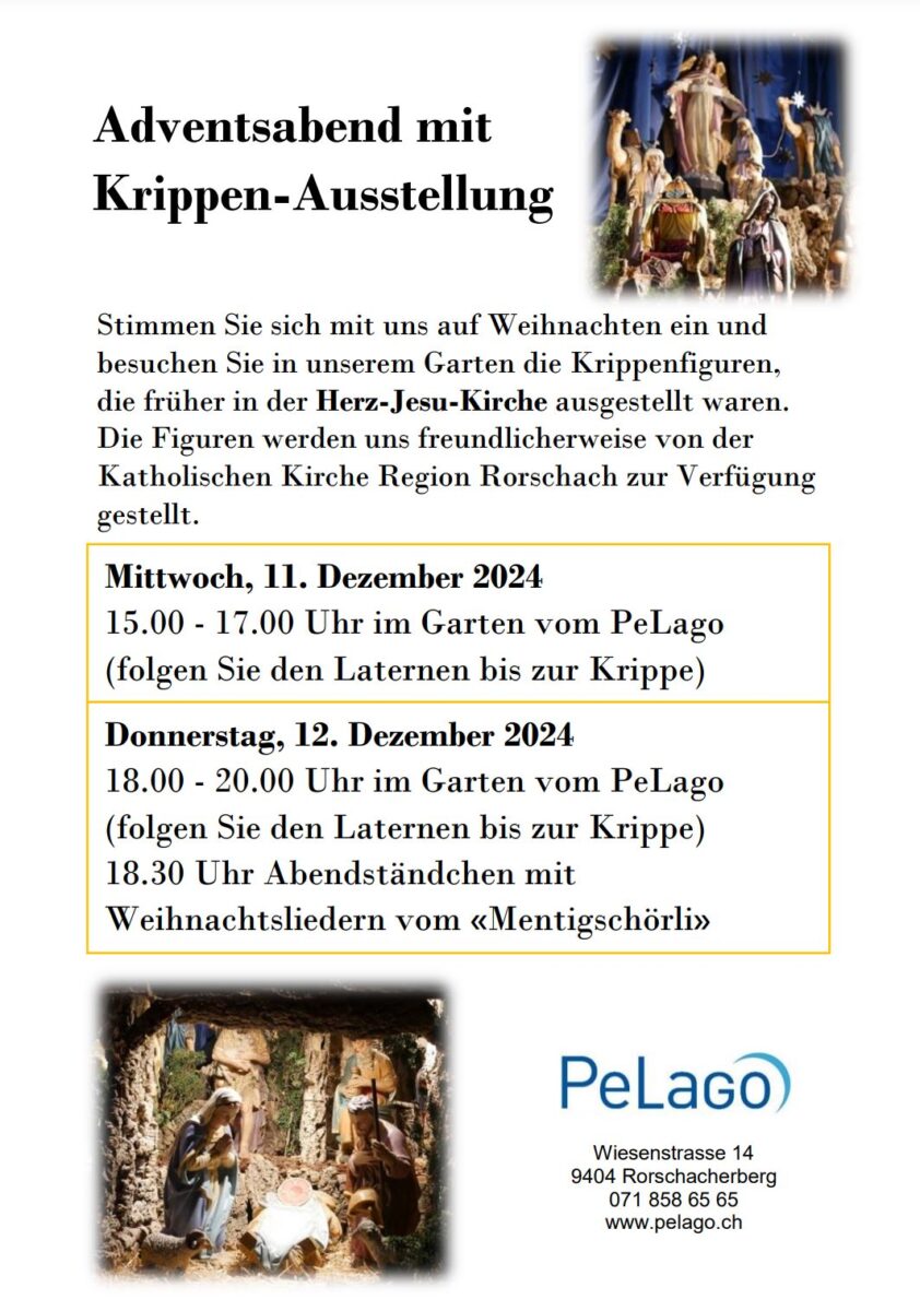 Am 11. und 12. Dezember 2024 lädt das Team des PeLago alle Interessierten ein, um die schönen Krippenfiguren, die bisher in der Herz-Jesu-Kirche zu sehen waren, noch einmal zu bestaunen. Diese wurden dem PeLago freundlicherweise von der Katholischen Kirche der Region Rorschach zur Verfügung gestellt. Das PeLago-Team freut sich, einen Teil der Figuren nochmals ausstellen zu können. (Text/Flyer: pd pelago jc)