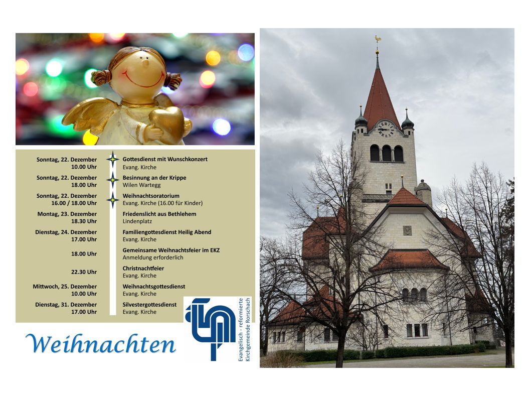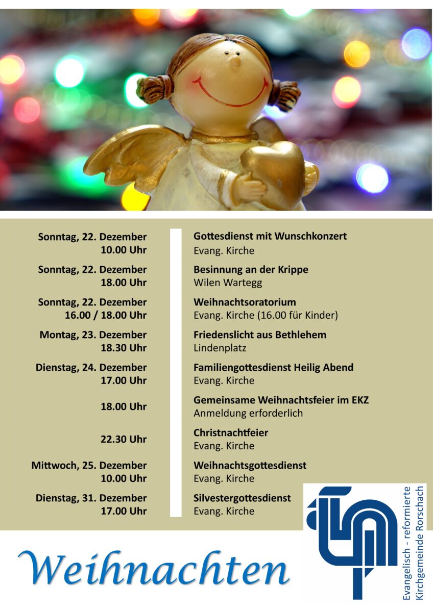 Der Weihnachtsreigen beginnt bereits morgen SonntagThemen:KulturPartnerRef. RorschachRorschach 21. Dezember 2024 - 05:20Das Weihnachtsangebot der Evang.-ref. Kirchgemeinde Rorschach ist sehr vielfältig. Die wichtigsten Informationen findet man immer auch hier, hier und hier.Teilen mit: Einen Link per E-Mail an einen Freund senden (Wird in neuem Fenster geöffnet) E-Mail Drucken (Wird in neuem Fenster geöffnet) Drucken Auf Facebook teilen (Wird in neuem Fenster geöffnet) Facebook Auf X teilen (Wird in neuem Fenster geöffnet) X Auf WhatsApp teilen (Wird in neuem Fenster geöffnet) WhatsApp Gefällt mir:Gefällt mir Wird geladen …Newsletter abonnieren Bitte dieses Feld leer lassenBitte wähle, ob Du über jeden neuen Beitrag sofort oder lieber jeden Morgen gegen 9 Uhr eine Zusammenfassung der neusten Beiträge erhalten möchtest.Liste(n) auswählen: Neues vom Echo (Zusammenfassung) Neues vom Echo (Sofortbenachrichtigung) Dieses Feld wird benötigt.Prüfen Sie Ihren Posteingang und den Spamordner, um Ihr Abonnement zu bestätigen.