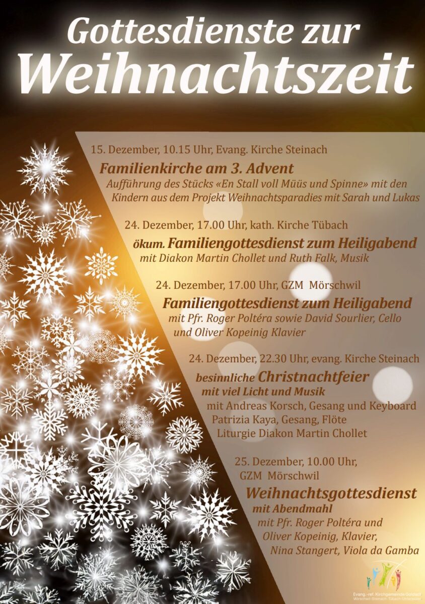 Weihnachten in der Ref. Kirchgemeinde GoldachThemen:GoldachKulturPartnerRef. GoldachRegion 21. Dezember 2024 - 05:10Hier eine Gesamtübersicht. Details findet man immer auch hier. Teilen mit: Einen Link per E-Mail an einen Freund senden (Wird in neuem Fenster geöffnet) E-Mail Drucken (Wird in neuem Fenster geöffnet) Drucken Auf Facebook teilen (Wird in neuem Fenster geöffnet) Facebook Auf X teilen (Wird in neuem Fenster geöffnet) X Auf WhatsApp teilen (Wird in neuem Fenster geöffnet) WhatsApp Gefällt mir:Gefällt mir Wird geladen …Newsletter abonnieren Bitte dieses Feld leer lassenBitte wähle, ob Du über jeden neuen Beitrag sofort oder lieber jeden Morgen gegen 9 Uhr eine Zusammenfassung der neusten Beiträge erhalten möchtest.Liste(n) auswählen: Neues vom Echo (Zusammenfassung) Neues vom Echo (Sofortbenachrichtigung) Dieses Feld wird benötigt.Prüfen Sie Ihren Posteingang und den Spamordner, um Ihr Abonnement zu bestätigen.