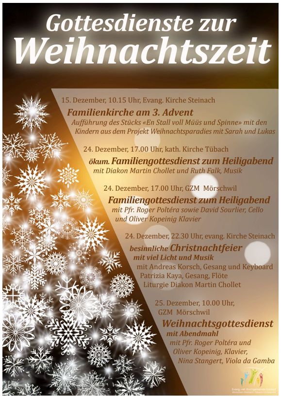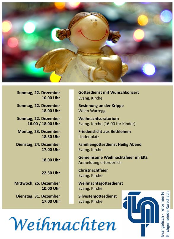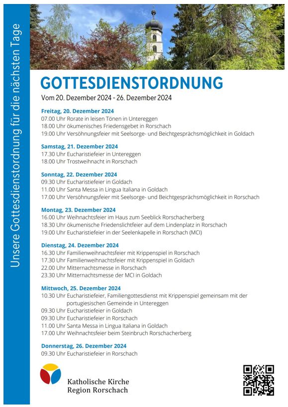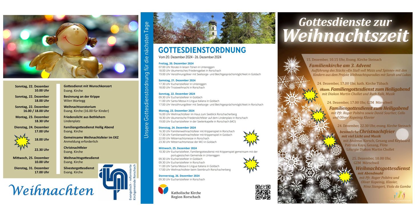 Das kirchliche Angebot über die WeihnachtstageThemen:Kath. RorschachKulturPartnerRef. GoldachRef. RorschachRegionRorschach 24. Dezember 2024 - 05:05Details findet man immer auch auf den Homepages: Ref. Rorschach, KKRR, Ref. Goldach. Teilen mit: Einen Link per E-Mail an einen Freund senden (Wird in neuem Fenster geöffnet) E-Mail Drucken (Wird in neuem Fenster geöffnet) Drucken Auf Facebook teilen (Wird in neuem Fenster geöffnet) Facebook Auf X teilen (Wird in neuem Fenster geöffnet) X Auf WhatsApp teilen (Wird in neuem Fenster geöffnet) WhatsApp Gefällt mir:Gefällt mir Wird geladen …Newsletter abonnieren Bitte dieses Feld leer lassenBitte wähle, ob Du über jeden neuen Beitrag sofort oder lieber jeden Morgen gegen 9 Uhr eine Zusammenfassung der neusten Beiträge erhalten möchtest.Liste(n) auswählen: Neues vom Echo (Zusammenfassung) Neues vom Echo (Sofortbenachrichtigung) Dieses Feld wird benötigt.Prüfen Sie Ihren Posteingang und den Spamordner, um Ihr Abonnement zu bestätigen.