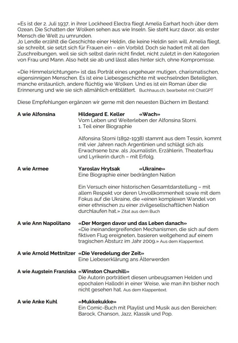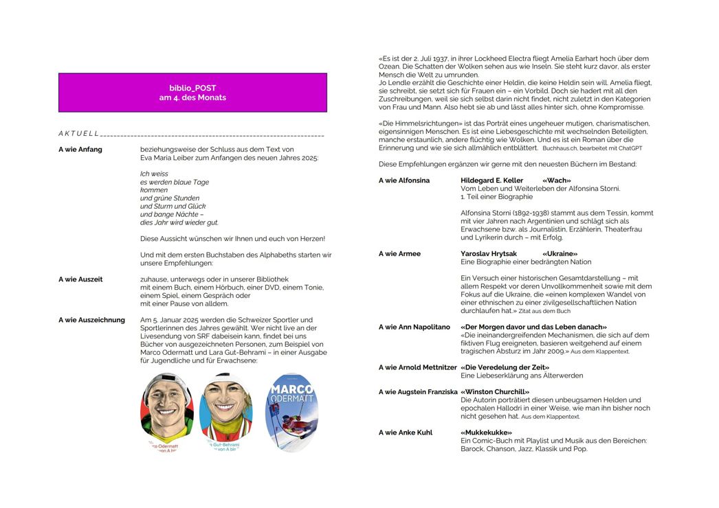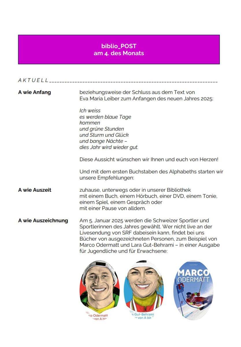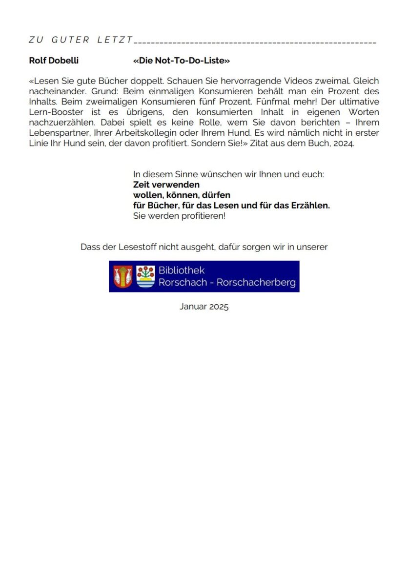 Auch 2025 gibt’s am 4. die News aus der BibliothekThemen:KulturRorschachRorschacherberg 4. Januar 2025 - 05:10Der Newsletter der Bibliothek Rorschach-Rorschacherberg wird von Imelda Natter erstellt. Voilà: Teilen mit: Einen Link per E-Mail an einen Freund senden (Wird in neuem Fenster geöffnet) E-Mail Drucken (Wird in neuem Fenster geöffnet) Drucken Auf Facebook teilen (Wird in neuem Fenster geöffnet) Facebook Auf X teilen (Wird in neuem Fenster geöffnet) X Auf WhatsApp teilen (Wird in neuem Fenster geöffnet) WhatsApp Gefällt mir:Gefällt mir Wird geladen …Newsletter abonnieren Bitte dieses Feld leer lassenBitte wähle, ob Du über jeden neuen Beitrag sofort oder lieber jeden Morgen gegen 9 Uhr eine Zusammenfassung der neusten Beiträge erhalten möchtest.Liste(n) auswählen: Neues vom Echo (Zusammenfassung) Neues vom Echo (Sofortbenachrichtigung) Dieses Feld wird benötigt.Prüfen Sie Ihren Posteingang und den Spamordner, um Ihr Abonnement zu bestätigen.