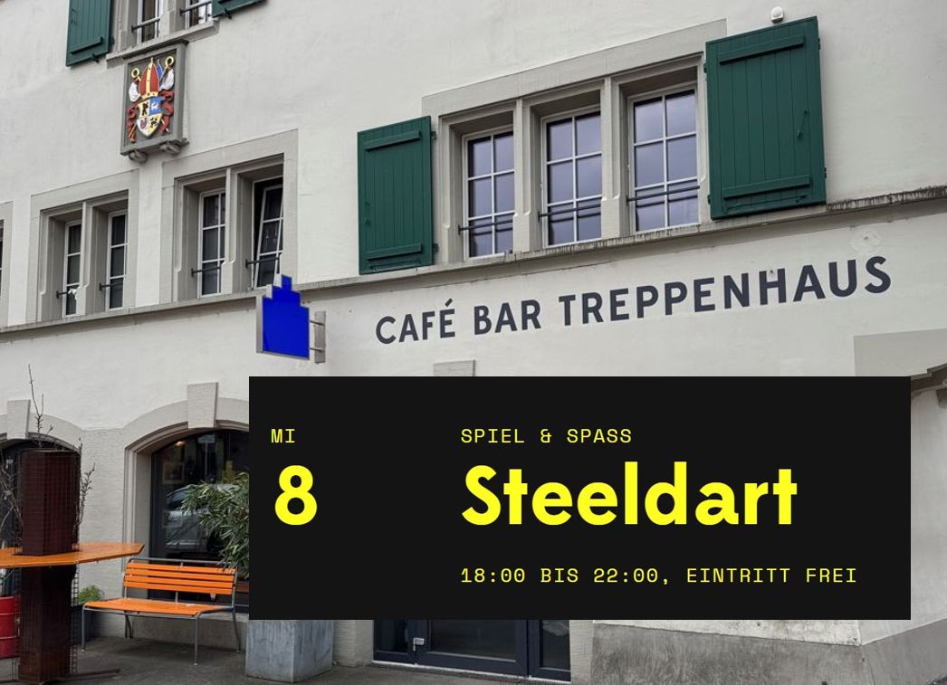 Ab morgen Mittwoch (und dann jeden Mittwoch) gibt es im Treppenhaus einen Steeldarts-Abend. Jeweils von 18 bis 22 Uhr. Es sind alle willkommen.
