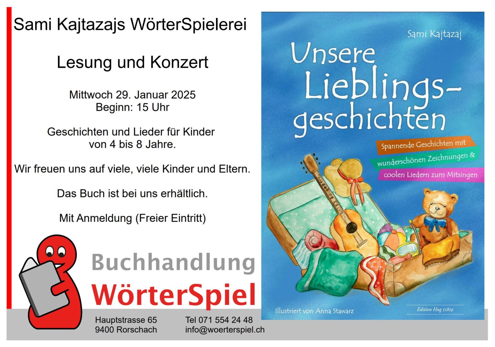 Am 29. Januar 2025 ist bei der Vorlesestunde Sami Kajtazaj um 15 Uhr zu Gast (Vorlesestunde WörterSpielerei). Die Lesung mit Musik ist für Kinder von 4 bis 8 Jahre und deren Erziehungsberechtigten. Wie immer ist eine Anmeldung erforderlich.