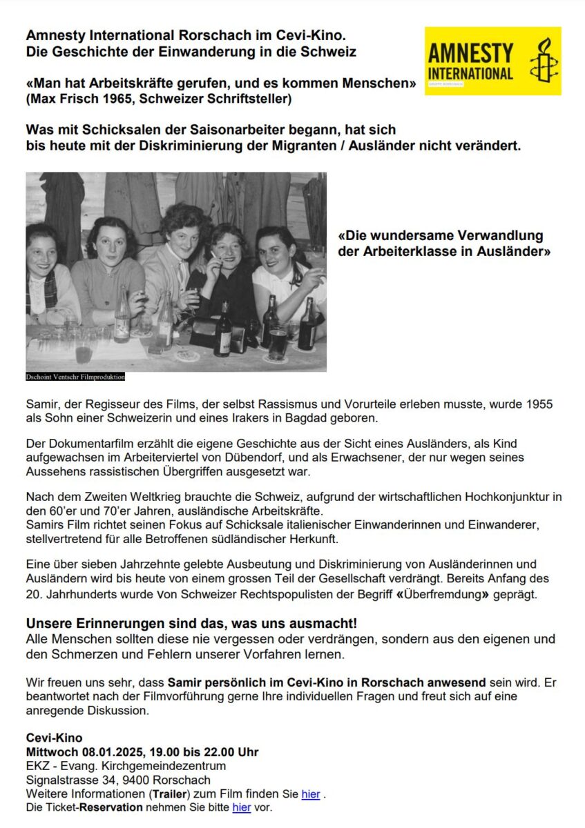 „Die wundersame Verwandlung der Arbeiterklasse in Ausländer“ heisst es heute Abend im Rorschacher Cevi-Kino im Evangelischen Kirchgemeindezentrum von 19 bis 22 Uhr. Die Amnesty International Gruppe Rorschach hat diesen Film mit organisiert und im Anschluss findet ein Gespräch mit Regisseur Samir statt.