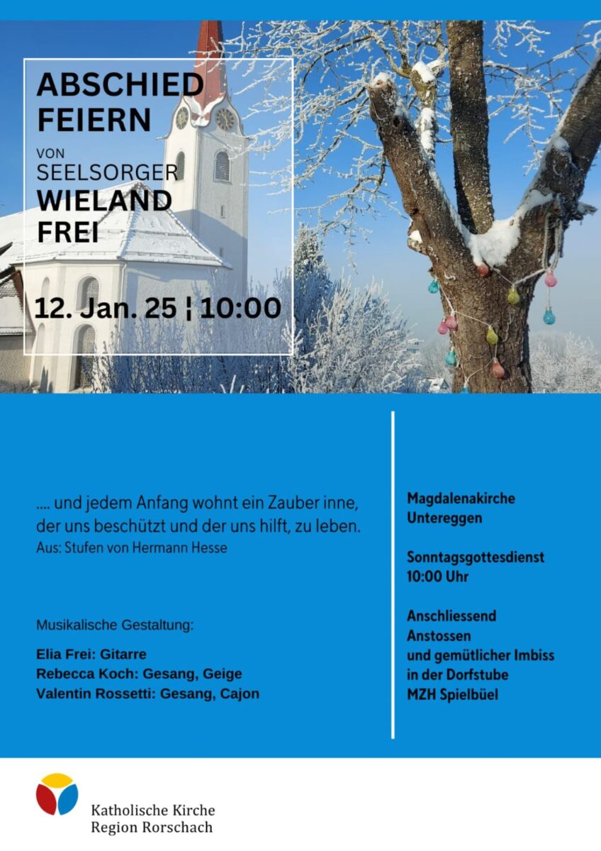 KKRR nimmt Abschied von Seelsorger Wieland FreiThemen:Kath. RorschachKulturPartnerRegionRorschach 11. Januar 2025 - 05:25Alle sind herzlich morgen Sonntag, 12. Januar 2025, 10.00 Uhr zum Gottesdienst mit anschliessendem Apéro in die Magdalena-Kirche in Untereggen eingeladen.Teilen mit: Klicken, um einem Freund einen Link per E-Mail zu senden (Wird in neuem Fenster geöffnet) E-Mail Klicken zum Ausdrucken (Wird in neuem Fenster geöffnet) Drucken Klick, um auf Facebook zu teilen (Wird in neuem Fenster geöffnet) Facebook Klicke, um auf X zu teilen (Wird in neuem Fenster geöffnet) X Klicken, um auf WhatsApp zu teilen (Wird in neuem Fenster geöffnet) WhatsApp Gefällt mir:Gefällt mir Wird geladen …Newsletter abonnieren Bitte dieses Feld leer lassenBitte wähle, ob Du über jeden neuen Beitrag sofort oder lieber jeden Morgen gegen 9 Uhr eine Zusammenfassung der neusten Beiträge erhalten möchtest.Liste(n) auswählen: Neues vom Echo (Zusammenfassung) Neues vom Echo (Sofortbenachrichtigung) Dieses Feld wird benötigt.Prüfen Sie Ihren Posteingang und den Spamordner, um Ihr Abonnement zu bestätigen.