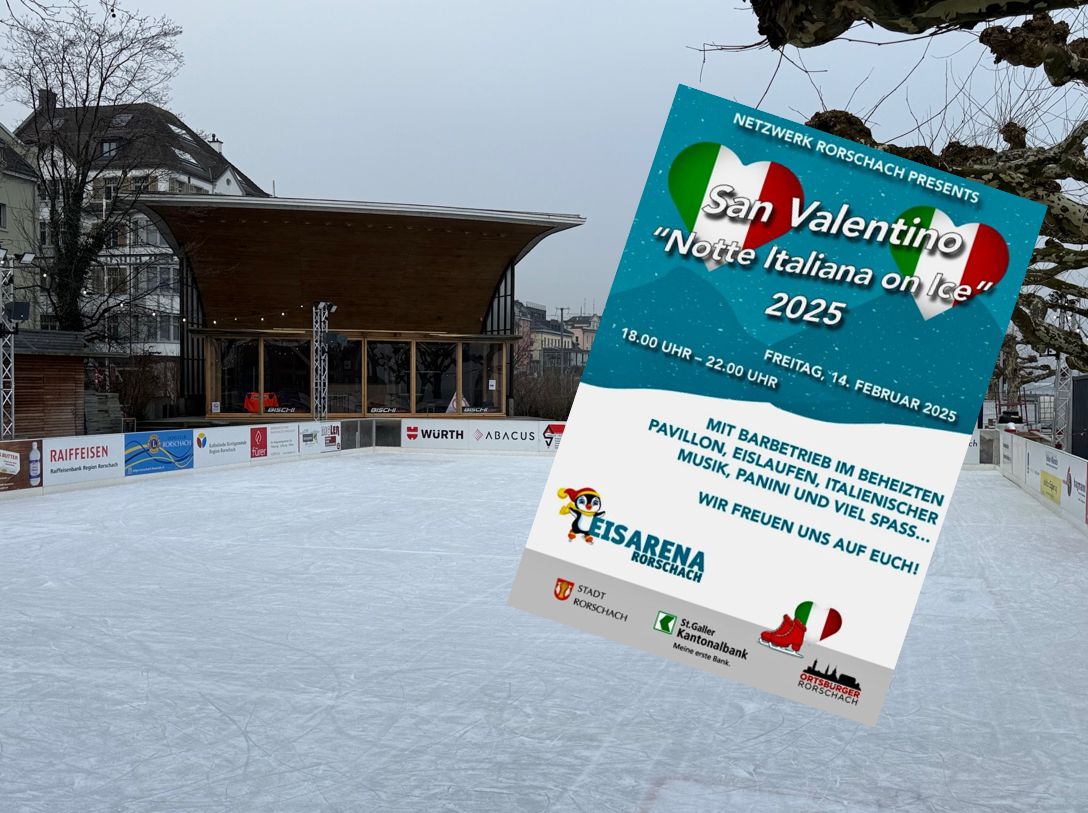 Kommenden Freitag zwischen 18 und 22 Uhr beim Pavillon am Rorschacher Hafen. Details findet man auf dem Flyer – und die ersten 5 Frauen und Männer, die da nach 18 Uhr auftauchen, erwartet noch eine Überraschung. Viel Spass auf dem Eis mit der Liebsten oder dem Liebsten im Arm. Das Ambiente verspricht viel Amore…