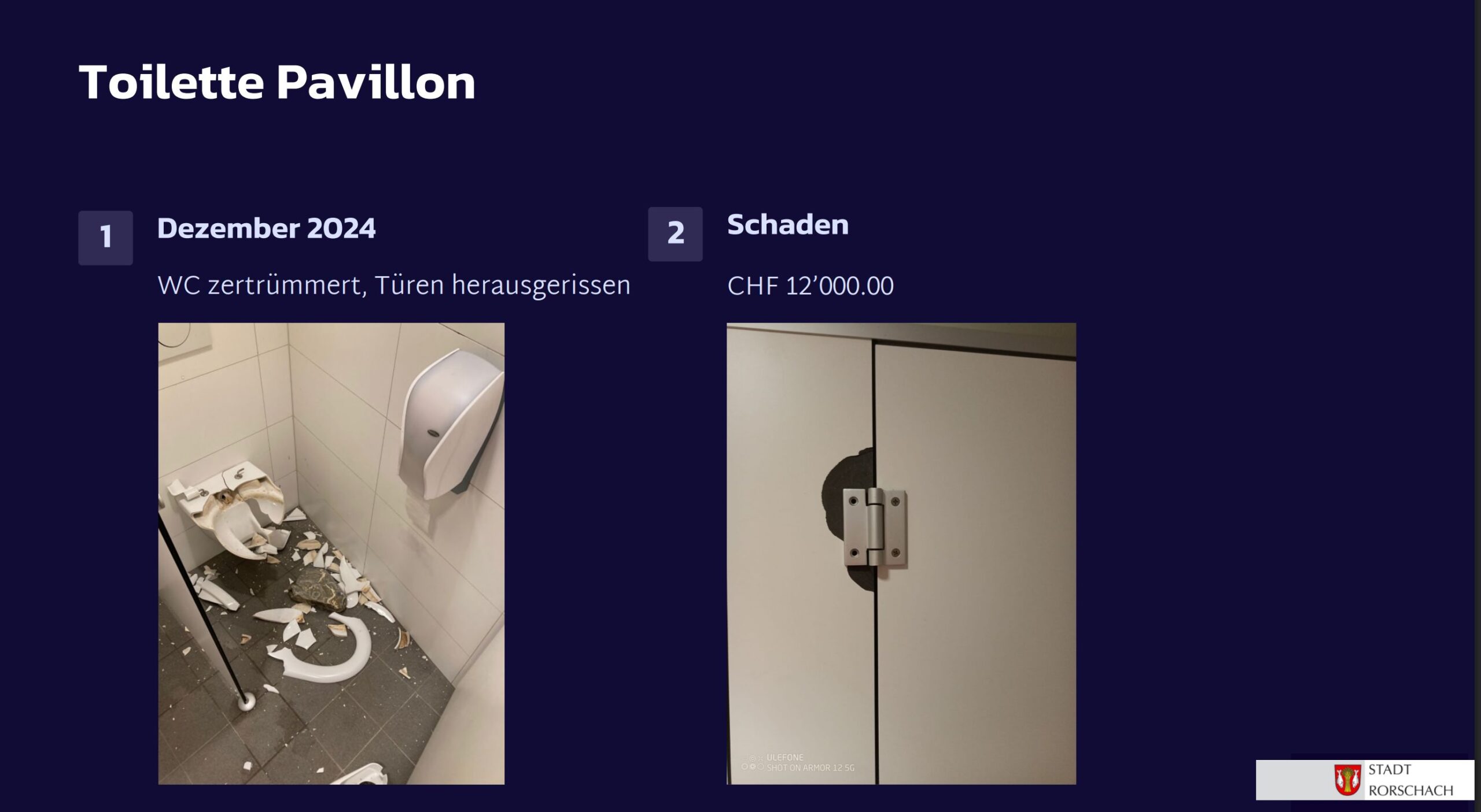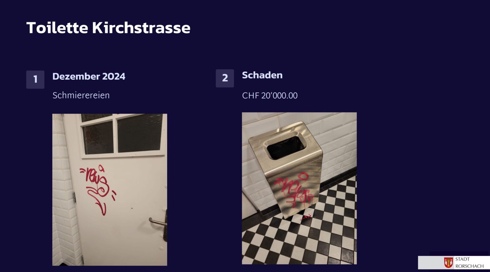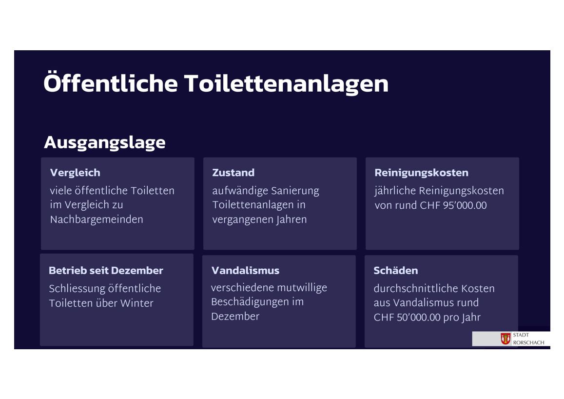 Seit dem gestrigen Stadtapéro wissen wir jetzt auch, weshalb viele öffentliche WC-Anlagen in der Stadt Rorschach geschlossen sind: Vandalismus. Das ist eigentlich immer doof, kostet viel Geld und braucht viele Nerven. Stadtpräsident Röbi Raths stellte zumindest in Aussicht, dass auf den Frühling hin einige WC-Anlagen wieder zugänglich sein sollten. Schwer nachzuvollziehen ist aber, weshalb eine Sanierung des kleinen WC-Häuschens beim Bellevue/Seerestaurant rund eine Viertelmillion Franken kosten soll. Und vielleicht macht man sich auch einmal schlau, ob es intelligentere Lösungen als das Schliessen solcher Anlagen gibt. Aber man darf auch davon ausgehen, dass uns diese Thematik wohl noch etwas begleiten wird…