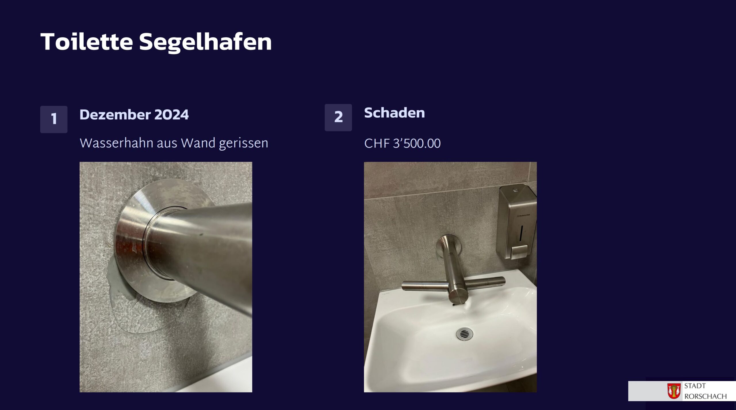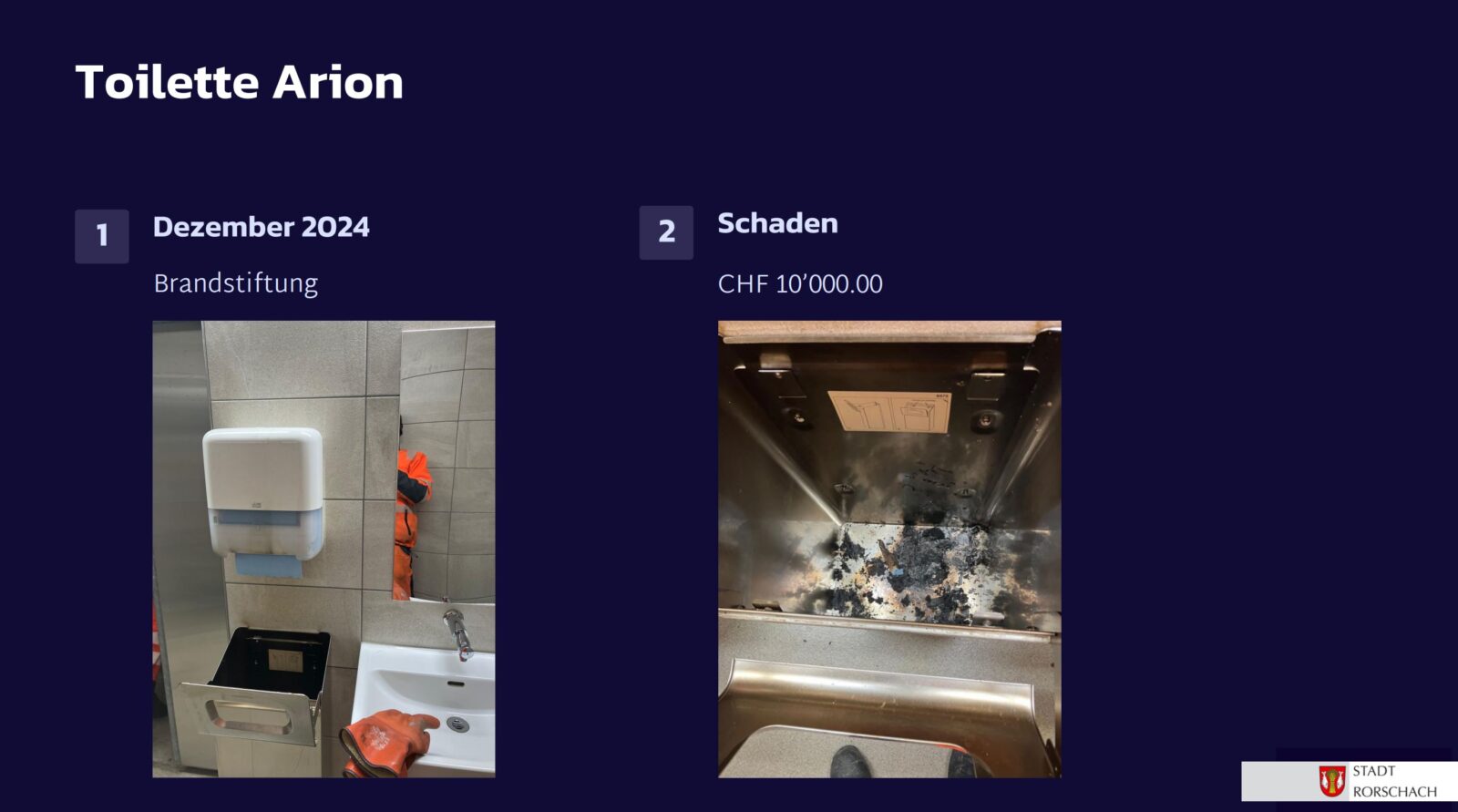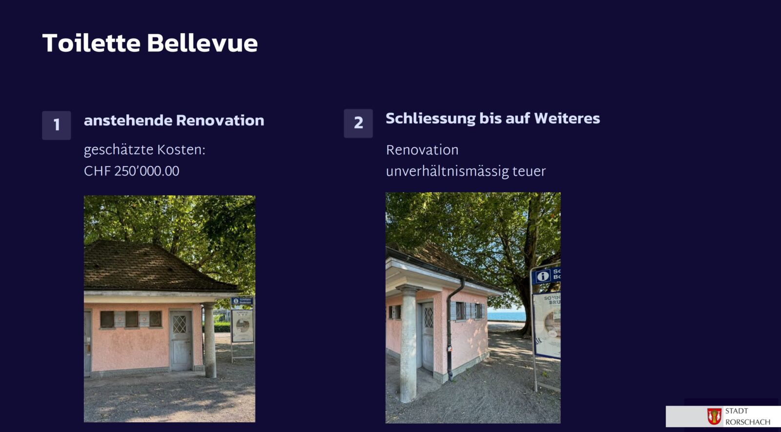 Seit dem gestrigen Stadtapéro wissen wir jetzt auch, weshalb viele öffentliche WC-Anlagen in der Stadt Rorschach geschlossen sind: Vandalismus. Das ist eigentlich immer doof, kostet viel Geld und braucht viele Nerven. Stadtpräsident Röbi Raths stellte zumindest in Aussicht, dass auf den Frühling hin einige WC-Anlagen wieder zugänglich sein sollten. Schwer nachzuvollziehen ist aber, weshalb eine Sanierung des kleinen WC-Häuschens beim Bellevue/Seerestaurant rund eine Viertelmillion Franken kosten soll. Und vielleicht macht man sich auch einmal schlau, ob es intelligentere Lösungen als das Schliessen solcher Anlagen gibt. Aber man darf auch davon ausgehen, dass uns diese Thematik wohl noch etwas begleiten wird…