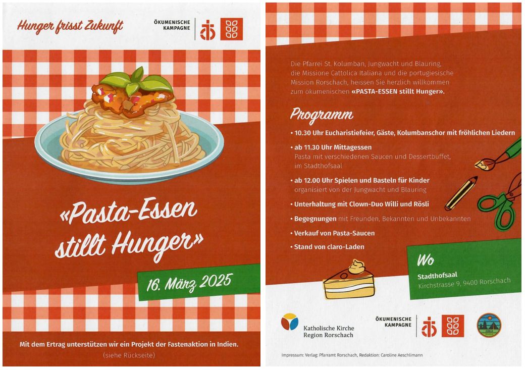 Es geht um mehr als nur gemeinsam Pasta zu essen!Themen:Kath. RorschachKulturPartnerRorschach 20. Februar 2025 - 05:20Dies als erste Vorinfo. Die Plakate sind ja auch nicht mehr zu übersehen. Erste Details findet man auf dem Flyer unten.Teilen mit: Einen Link per E-Mail an einen Freund senden (Wird in neuem Fenster geöffnet) E-Mail Drucken (Wird in neuem Fenster geöffnet) Drucken Auf Facebook teilen (Wird in neuem Fenster geöffnet) Facebook Auf X teilen (Wird in neuem Fenster geöffnet) X Auf WhatsApp teilen (Wird in neuem Fenster geöffnet) WhatsApp Gefällt mir:Gefällt mir Wird geladen …Newsletter abonnieren Bitte dieses Feld leer lassenBitte wähle, ob Du über jeden neuen Beitrag sofort oder lieber jeden Morgen gegen 9 Uhr eine Zusammenfassung der neusten Beiträge erhalten möchtest.Liste(n) auswählen: Neues vom Echo (Zusammenfassung) Neues vom Echo (Sofortbenachrichtigung) Dieses Feld wird benötigt.Prüfen Sie Ihren Posteingang und den Spamordner, um Ihr Abonnement zu bestätigen.