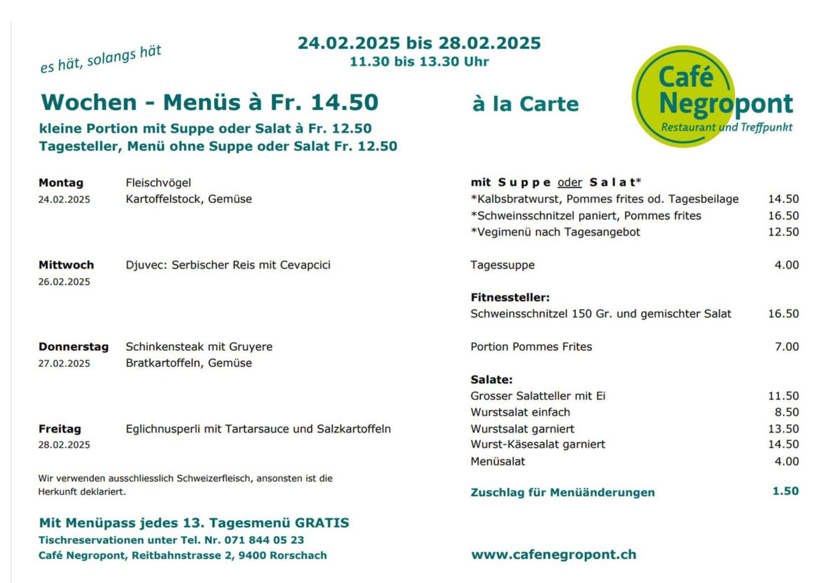 Hier die Wochen-Menüs mit dem speziellen Angebot zum „Schmotzige Donschtig“. Mehr rund um das Negropont finden Interessierte hier.