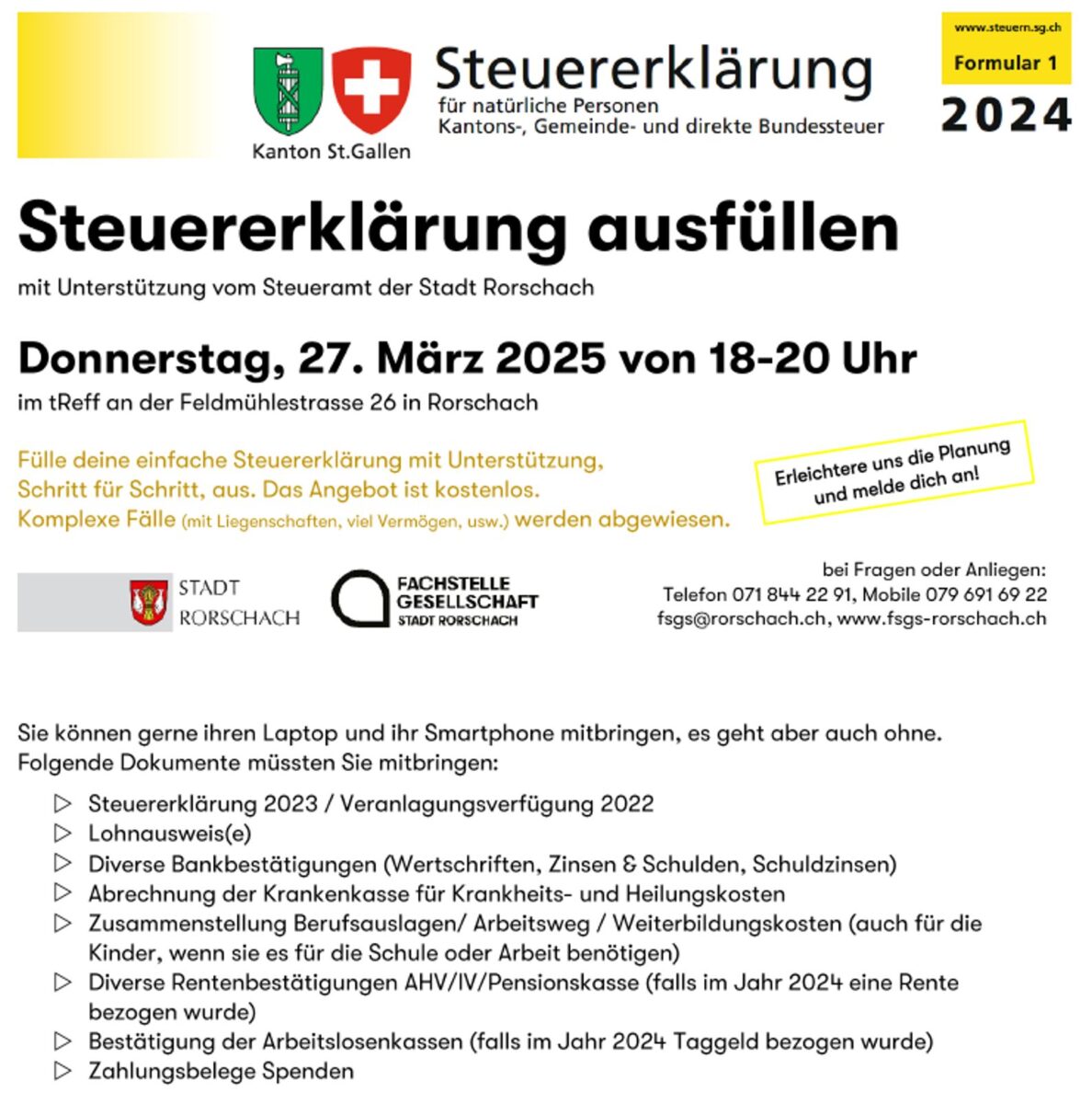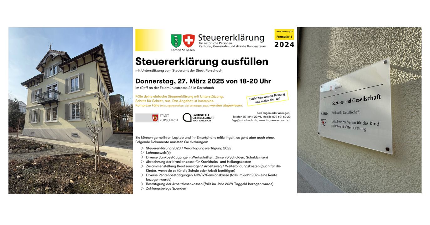 Vormerken: Am Donnerstag, 27. März 2025, zwischen 18 und 21 Uhr, wird in der Fachstelle Gesellschaft in Rorschach Unterstützung beim Ausfüllen einer einfachen Steuererklärungen angeboten. Man geht gemeinsam Schritt für Schritt vor. Das Angebot ist kostenlos. Komplexe Fälle (mit Liegenschaften, viel Vermögen, usw.) werden abgewiesen.