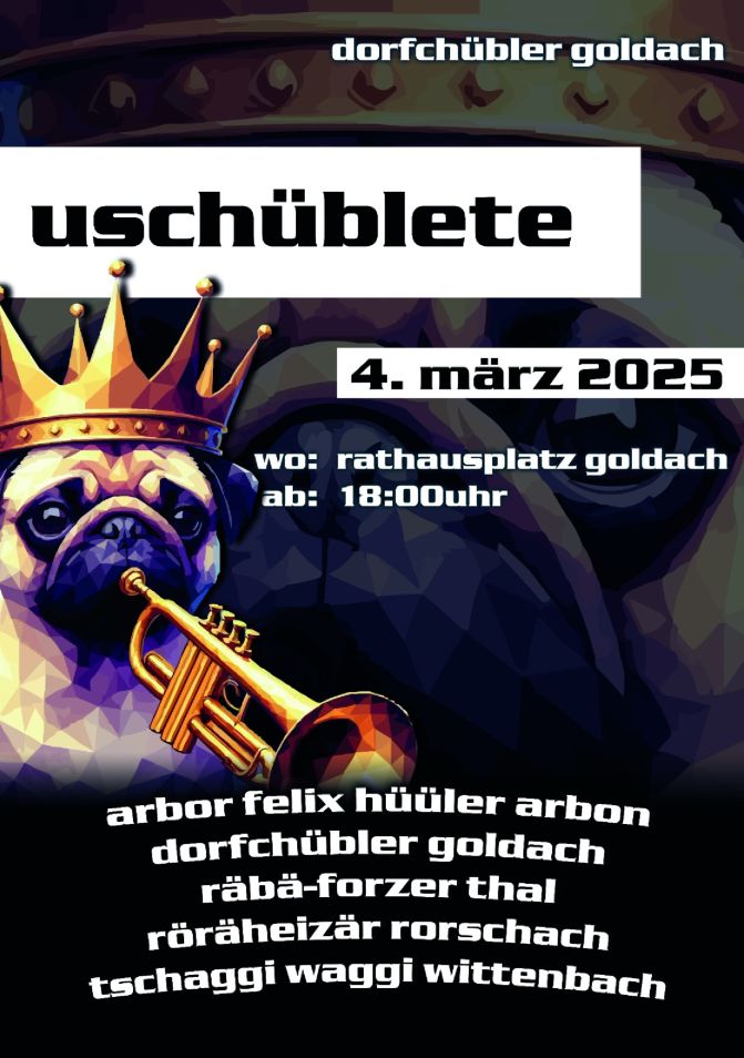 Übermorgen ist die Fasnacht schon wieder vorbei…Themen:GoldachKultur 2. März 2025 - 05:10Die Dorfchübler Goldach werden aber dafür sorgen, dass die närrische Zeit noch etwas in den Ohren nachhallt…Plakat: pd dorfchübler goldachTeilen mit: Einen Link per E-Mail an einen Freund senden (Wird in neuem Fenster geöffnet) E-Mail Drucken (Wird in neuem Fenster geöffnet) Drucken Auf Facebook teilen (Wird in neuem Fenster geöffnet) Facebook Auf X teilen (Wird in neuem Fenster geöffnet) X Auf WhatsApp teilen (Wird in neuem Fenster geöffnet) WhatsApp Gefällt mir:Gefällt mir Wird geladen …Newsletter abonnieren Bitte dieses Feld leer lassenBitte wähle, ob Du über jeden neuen Beitrag sofort oder lieber jeden Morgen gegen 9 Uhr eine Zusammenfassung der neusten Beiträge erhalten möchtest.Liste(n) auswählen: Neues vom Echo (Zusammenfassung) Neues vom Echo (Sofortbenachrichtigung) Dieses Feld wird benötigt.Prüfen Sie Ihren Posteingang und den Spamordner, um Ihr Abonnement zu bestätigen.