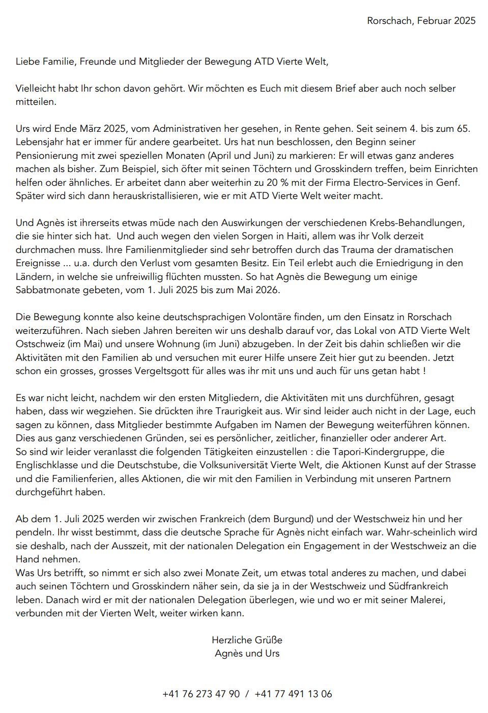Agnès und Urs haben Ende letzter Woche nachstehenden Brief verschickt: