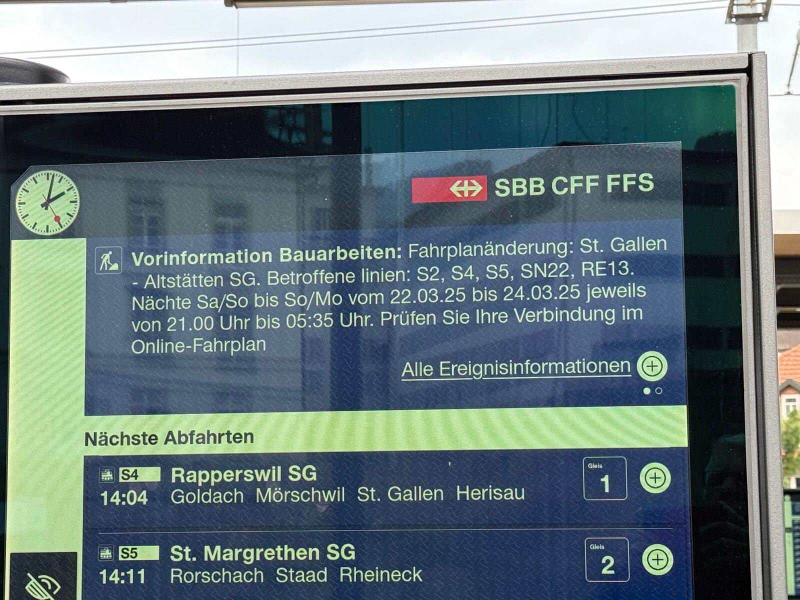 Ab Samstag Abend SBB-Fahrplan konsultierenThemen:RegionRorschach 18. März 2025 - 05:05Es wird wieder am Schienennetz gearbeitet. Was wann wo sieht man auf dem Bild.Teilen mit: Einen Link per E-Mail an einen Freund senden (Wird in neuem Fenster geöffnet) E-Mail Drucken (Wird in neuem Fenster geöffnet) Drucken Auf Facebook teilen (Wird in neuem Fenster geöffnet) Facebook Auf X teilen (Wird in neuem Fenster geöffnet) X Auf WhatsApp teilen (Wird in neuem Fenster geöffnet) WhatsApp Gefällt mir:Gefällt mir Wird geladen …Newsletter abonnieren Bitte dieses Feld leer lassenBitte wähle, ob Du über jeden neuen Beitrag sofort oder lieber jeden Morgen gegen 9 Uhr eine Zusammenfassung der neusten Beiträge erhalten möchtest.Liste(n) auswählen: Neues vom Echo (Zusammenfassung) Neues vom Echo (Sofortbenachrichtigung) Dieses Feld wird benötigt.Prüfen Sie Ihren Posteingang und den Spamordner, um Ihr Abonnement zu bestätigen.