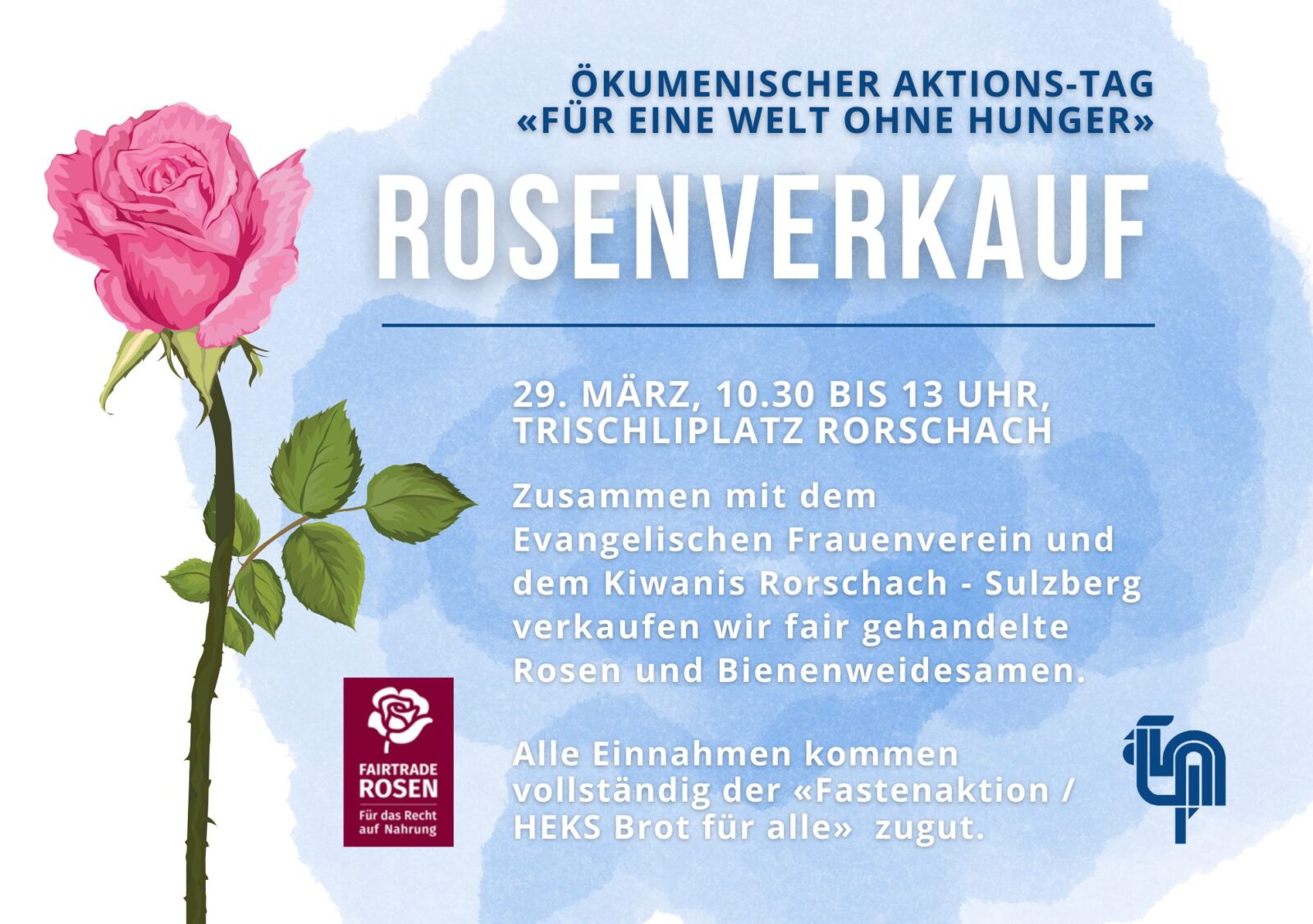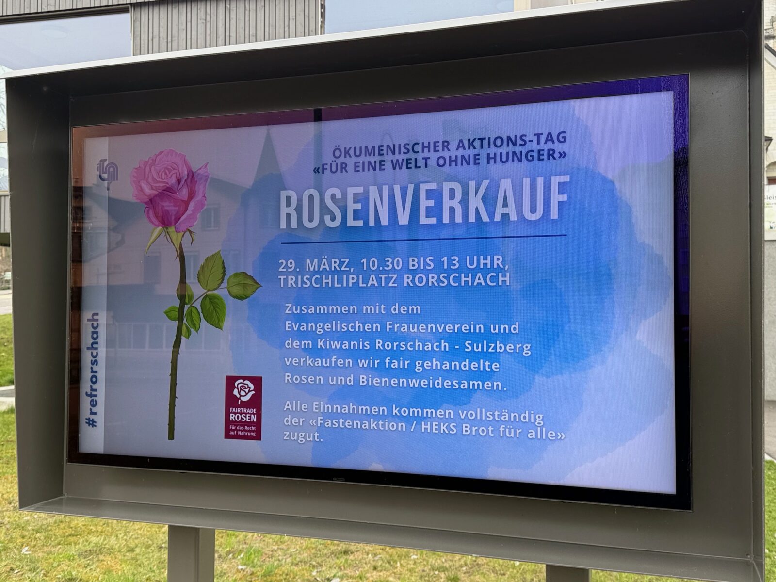 Das passiert zwischen 10.30 und 13 Uhr auf dem Trischliplatz in Rorschach. Dieser ökumenische Aktions-Tag mit dem Rosenverkauf ist „Für eine Welt ohne Hunger“ gewidmet. Mehr Infos dazu findet man hier.