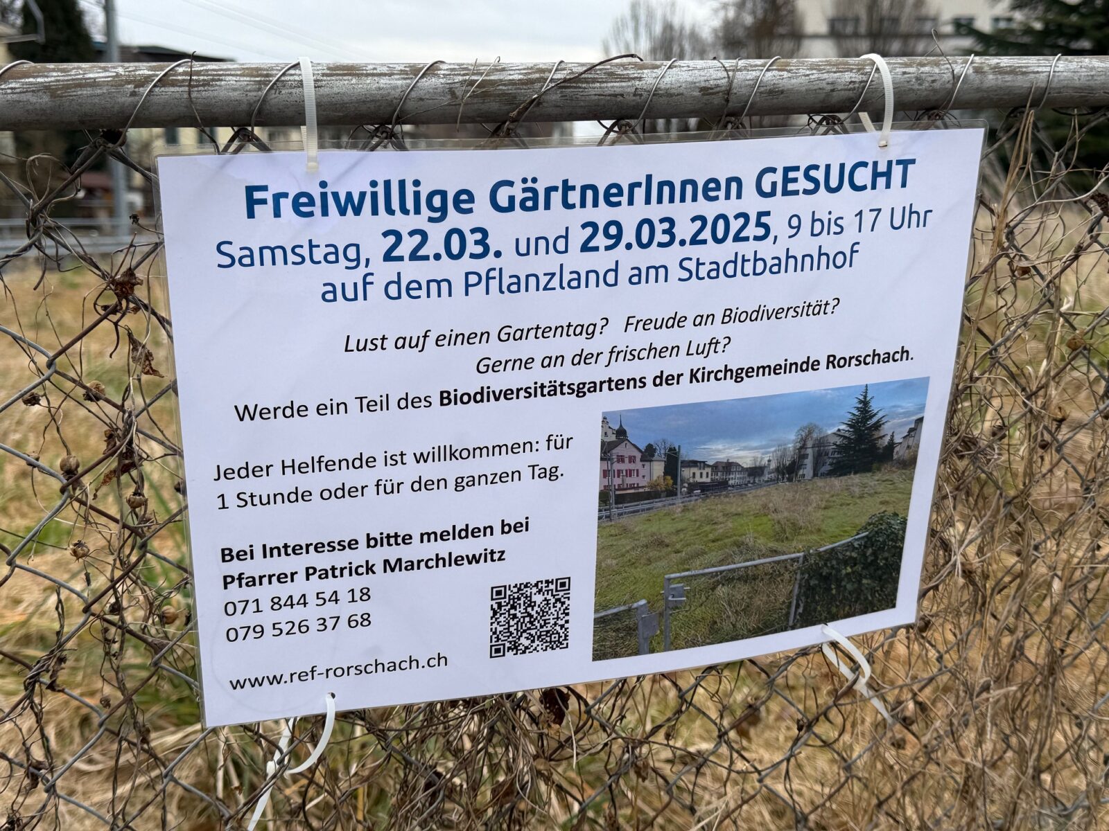 Morgen ist Teil 2 der ersten Arbeiten auf dem Areal zwischen Eisenbahn- und Burghaldenstrasse in unmittelbarer Nähe der Evangelischen Kirche Rorschach. Auch für morgen sind freiwillige GärtnerInnen gesucht, die von 9 bis 17 Uhr im Pflanzland beim Stadtbahnhof einen Arbeitseinsatz der „AG Pflanzland“ leisten. Die InitiantInnen freuen sich über jeden Helfenden für 1 Stunde oder für den ganzen Tag: von kleinen Erdarbeiten bis Kaffee und Kuchen.