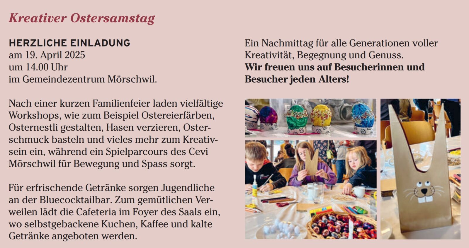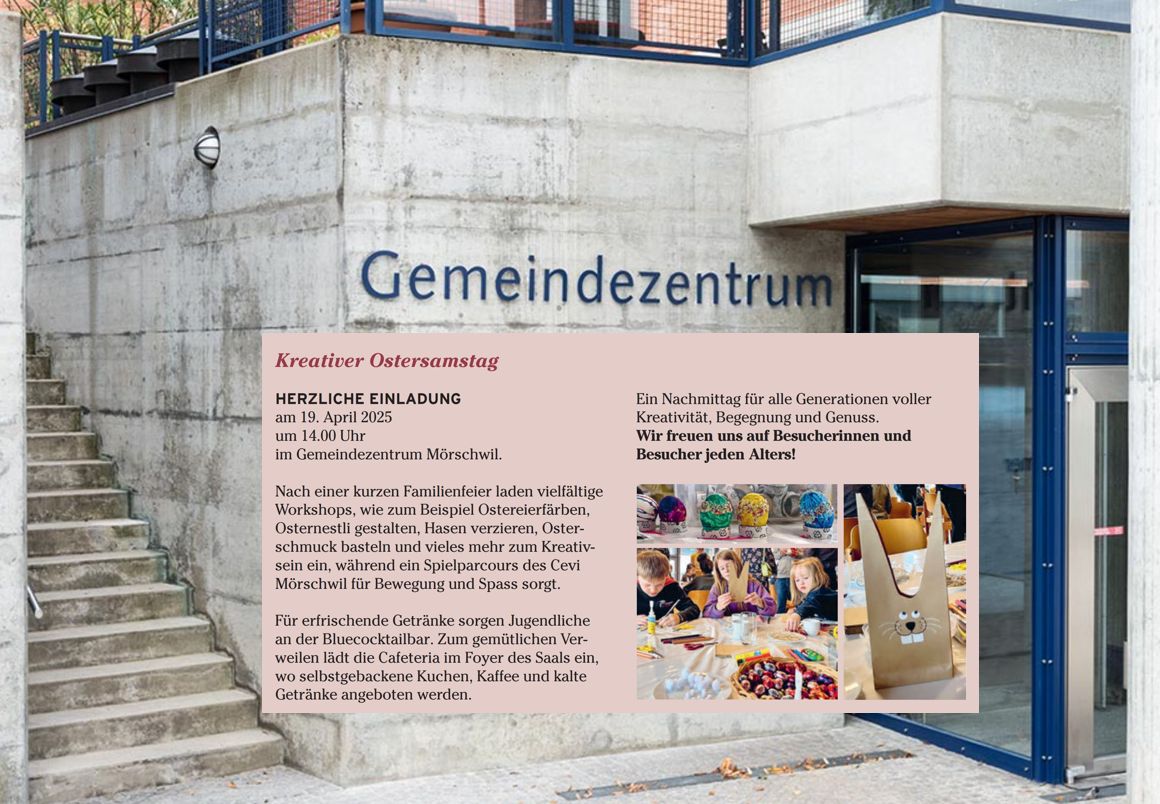 Ref. Goldach: Kreativer Ostersamstag erlebenThemen:GoldachKulturPartnerRef. GoldachRegion 29. März 2025 - 05:15Die Evang.-ref. Kirchgemeinde Goldach lädt ein auf Samstag, 19. April 2025, nach Mörschwil. Details findet man in der Ausschreibung unten.Teilen mit: Klicken, um einem Freund einen Link per E-Mail zu senden (Wird in neuem Fenster geöffnet) E-Mail Klicken zum Ausdrucken (Wird in neuem Fenster geöffnet) Drucken Klick, um auf Facebook zu teilen (Wird in neuem Fenster geöffnet) Facebook Klicke, um auf X zu teilen (Wird in neuem Fenster geöffnet) X Klicken, um auf WhatsApp zu teilen (Wird in neuem Fenster geöffnet) WhatsApp Gefällt mir:Gefällt mir Wird geladen …Newsletter abonnieren Bitte dieses Feld leer lassenBitte wähle, ob Du über jeden neuen Beitrag sofort oder lieber jeden Morgen gegen 9 Uhr eine Zusammenfassung der neusten Beiträge erhalten möchtest.Liste(n) auswählen: Neues vom Echo (Zusammenfassung) Neues vom Echo (Sofortbenachrichtigung) Dieses Feld wird benötigt.Prüfen Sie Ihren Posteingang und den Spamordner, um Ihr Abonnement zu bestätigen.