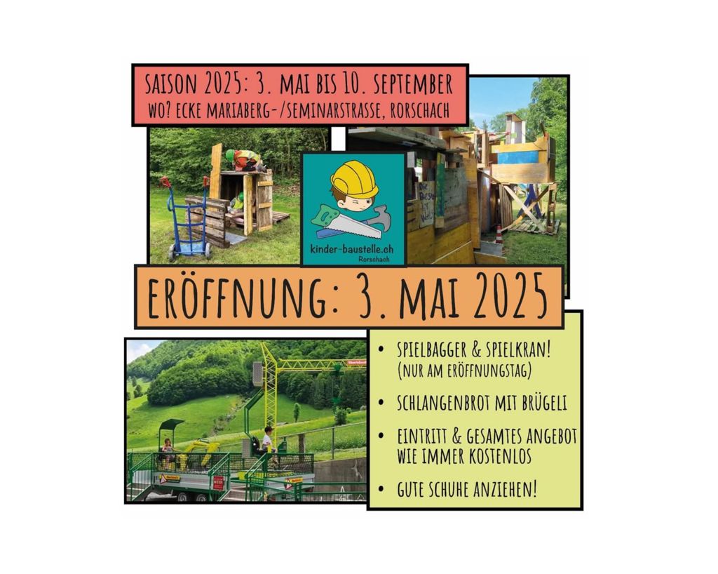Das wird vor allem die Kids freuen: Bauen auf dem Areal der Kinderbaustelle unter dem Mariaberg und fernab von Baubewilligung und dergleichen, aber mit viel Kreativität. Mehr zu diesem beliebten Event findet man hier und hier. Start ist Samstag, 3. Mai 2025.