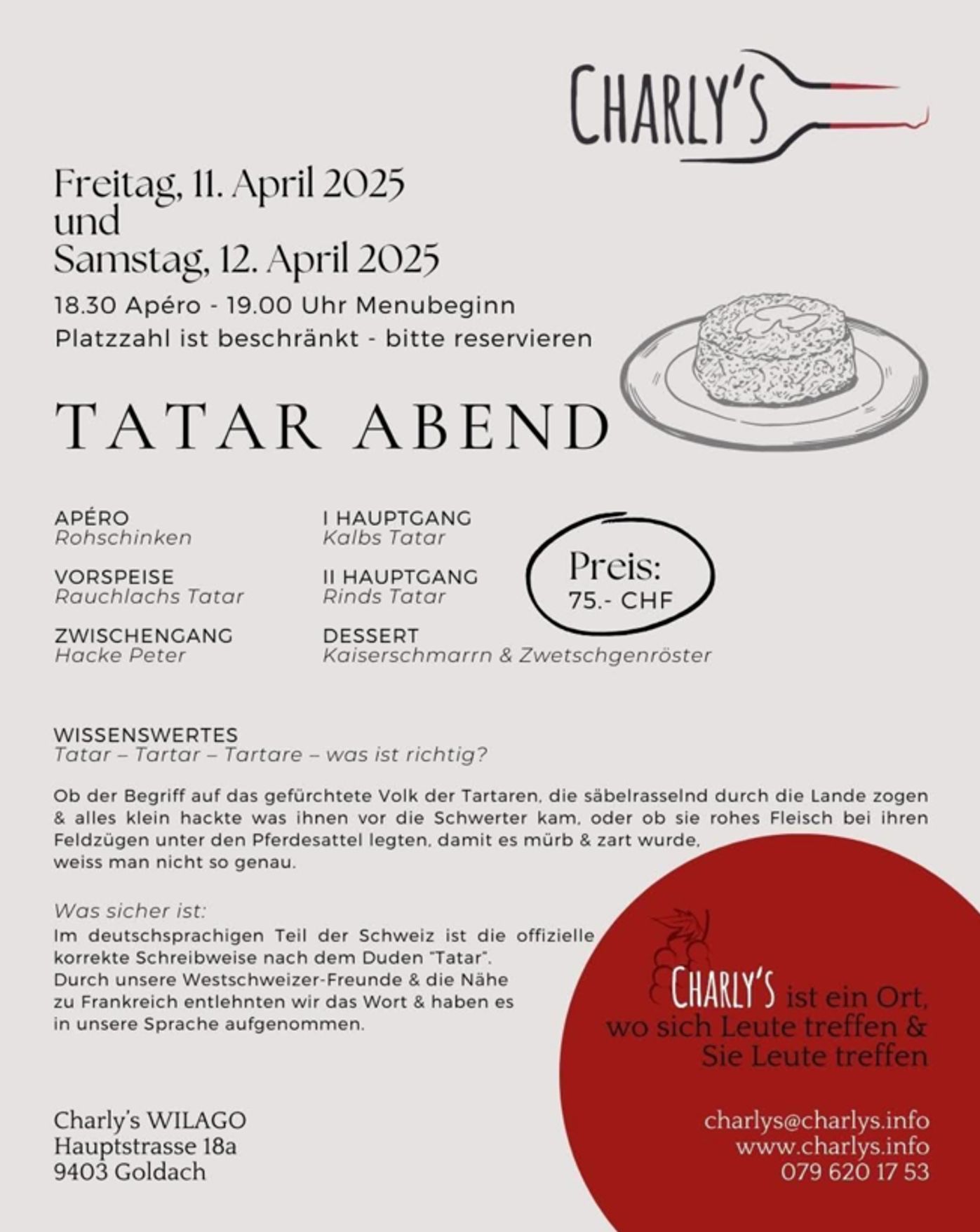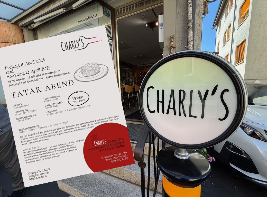 Am kommenden Wochenende gibt es bei Charly Piller in Goldach zwei Tatar-Abende. Freuen dürfen sich all jene, die da sofort reserviert haben, denn an beiden Tagen meldet Charly bereits: Ausverkauft. Mehr rund um das Charly’s findet man auch hier.