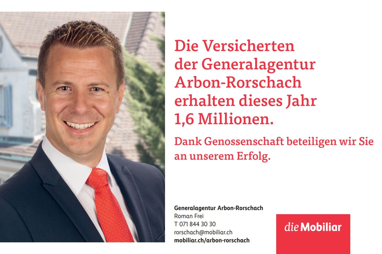 Das genossenschaftlich verankerte Unternehmen teilt seinen Erfolg: Wer bei der Mobiliar eine Haushalts- oder Gebäudeversicherung abgeschlossen hat, profitiert ein Jahr lang von einer Vergünstigung von je 20 Prozent. Kundinnen und Kunden mit einer Rechtsschutzversicherung kommen ebenfalls in den Genuss einer Prämienreduktion und sparen 10 Prozent. «In der Region Arbon und Rorschach fliessen so 1.6 Millionen Franken in Form von Prämienreduktionen an die rund
