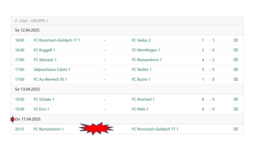 Unsere Fussballer müssen heute in Romanshorn ranThemen:FC Rorschach-Goldach 17 17. April 2025 - 05:10Anpfiff in Romanshorn ist heute um 20:15 Uhr. Das Resultat wird nachgereicht. Nachstehend die aktuelle Tabelle.Teilen mit: Einen Link per E-Mail an einen Freund senden (Wird in neuem Fenster geöffnet) E-Mail Drucken (Wird in neuem Fenster geöffnet) Drucken Auf Facebook teilen (Wird in neuem Fenster geöffnet) Facebook Auf X teilen (Wird in neuem Fenster geöffnet) X Auf WhatsApp teilen (Wird in neuem Fenster geöffnet) WhatsApp Gefällt mir:Gefällt mir Wird geladen …Newsletter abonnieren Bitte dieses Feld leer lassenBitte wähle, ob Du über jeden neuen Beitrag sofort oder lieber jeden Morgen gegen 9 Uhr eine Zusammenfassung der neusten Beiträge erhalten möchtest.Liste(n) auswählen: Neues vom Echo (Zusammenfassung) Neues vom Echo (Sofortbenachrichtigung) Dieses Feld wird benötigt.Prüfen Sie Ihren Posteingang und den Spamordner, um Ihr Abonnement zu bestätigen.