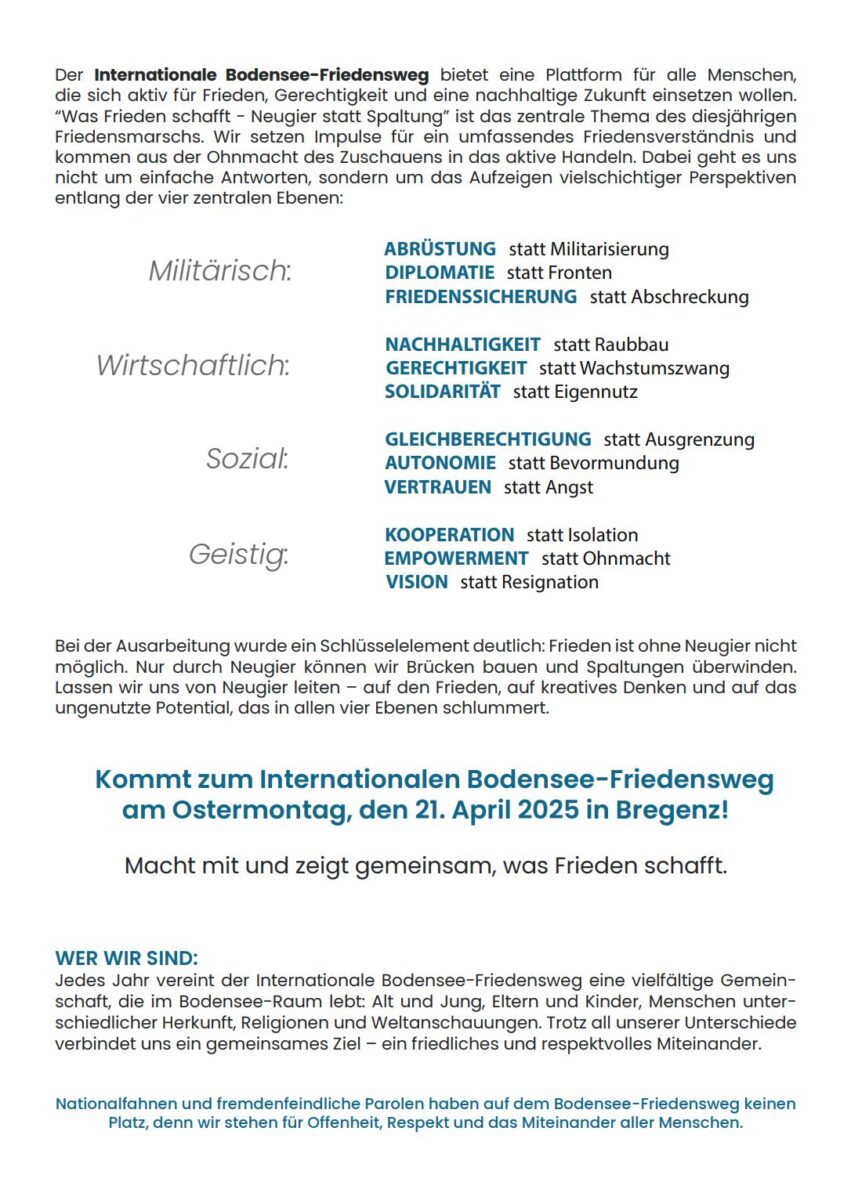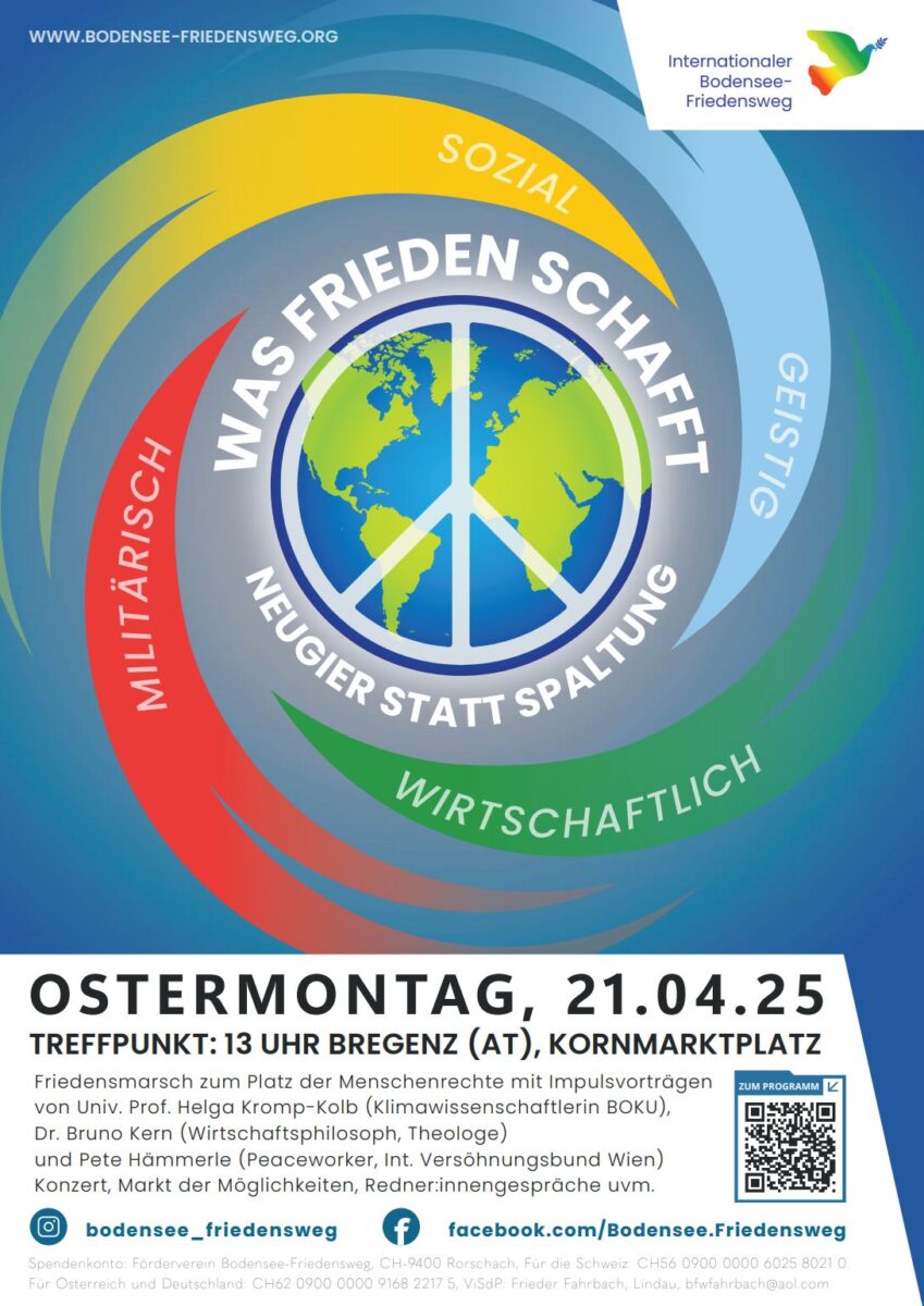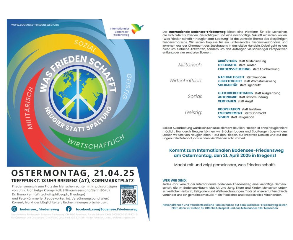 Heute Ostermontag, 21. April, findet wieder der Internationale Bodensee-Friedensweg statt, dieses Jahr in Bregenz. Thema: „Was Frieden schafft“. Beginn um 13 Uhr am Kornmarktplatz. Details findet man auf den Flyern unten. Mehr zum Programm findet man auch hier. Es ist schon ein Weilchen her, dass der Internationale Bodensee-Friedensweg in Rorschach durchgeführt wurde. (Flyer/Bild: pd ibfw ae)