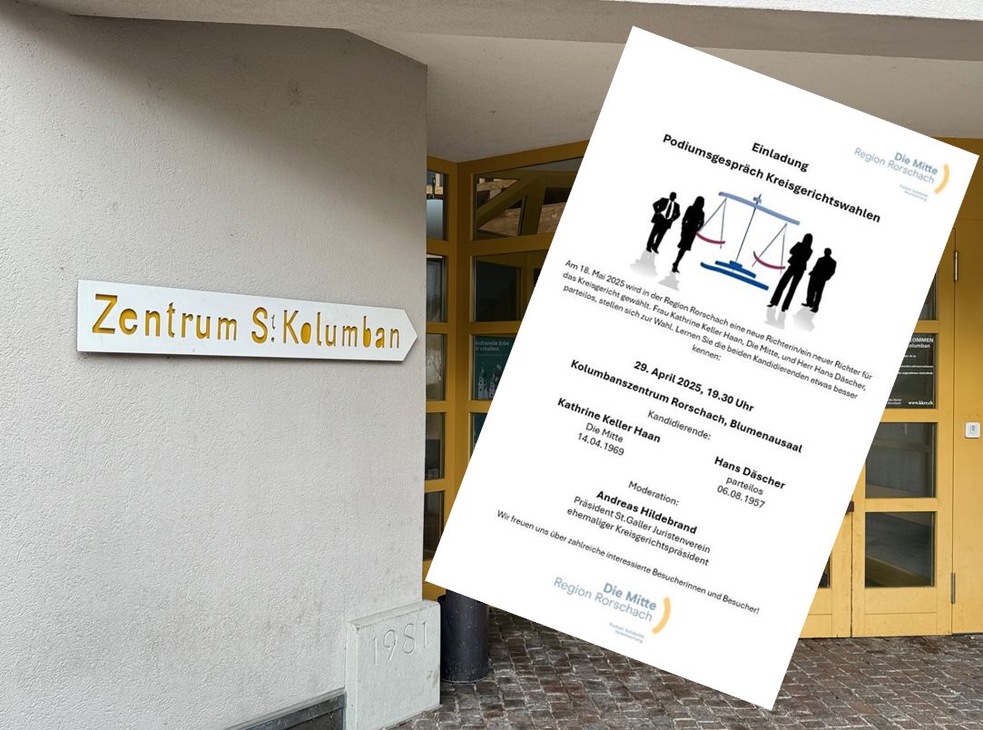 Wie bereits angekündigt, organisiert „Die Mitte Region Rorschach“ ein Podiumsgespräch mit den beiden Kandidierenden für das frei werdende Richteramt am Kreisgericht. Stattfinden wird diese Veranstaltung am Dienstag, 29. April um 19.30 Uhr im Kolumbanszentrum in Rorschach. Als Moderator konnte der Präsident des St.Galler Juristenvereins und ehemalige Kreisgerichtspräsident Andreas Hildebrand engagiert werden. Gewählt wird am 18. Mai 2025.