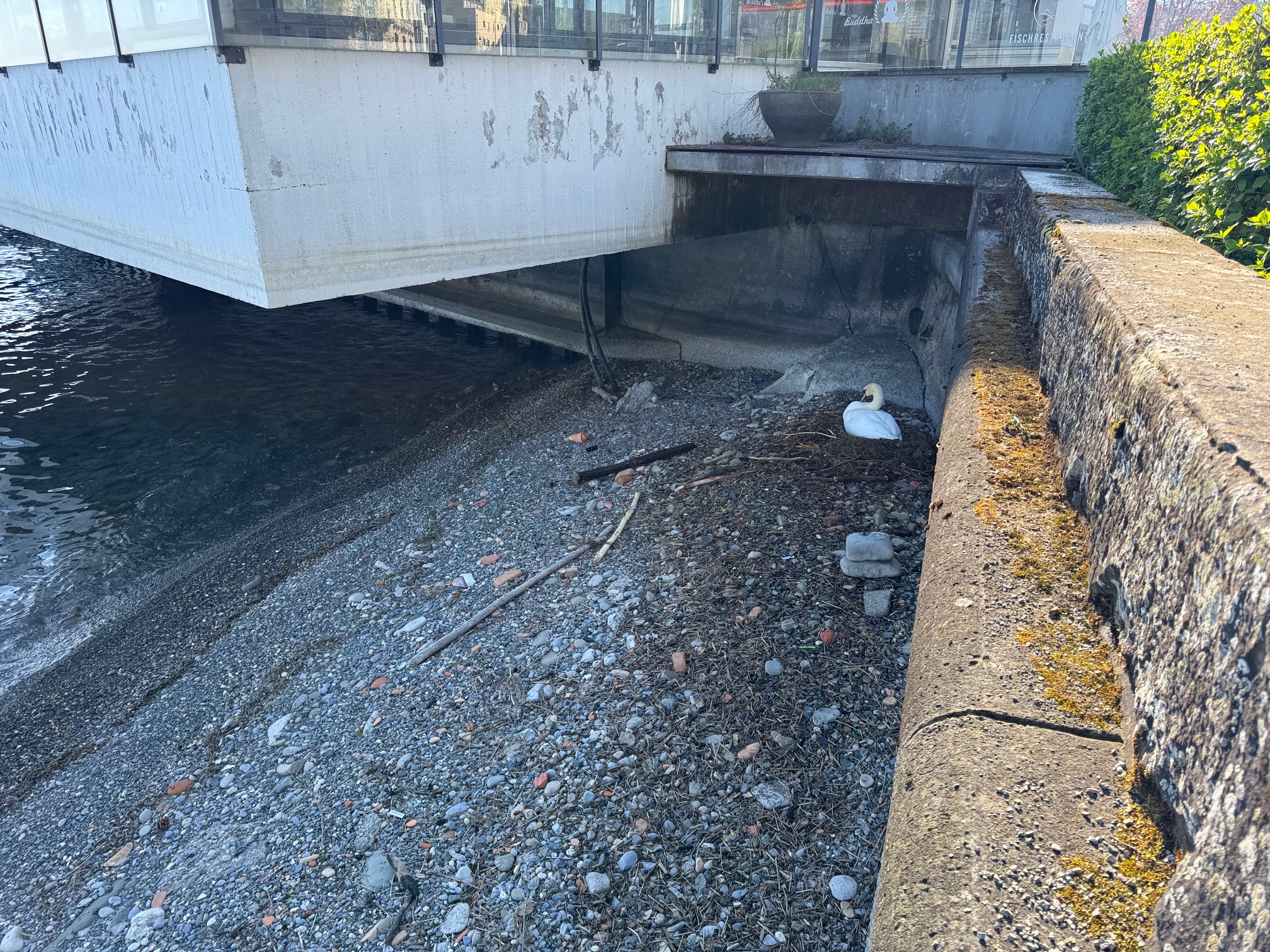 Die Badehütte Schwäne brüten im Rietli Hafen ganz hinten.