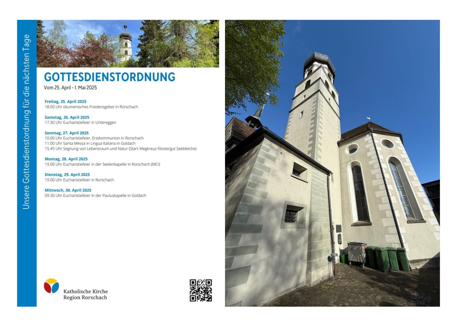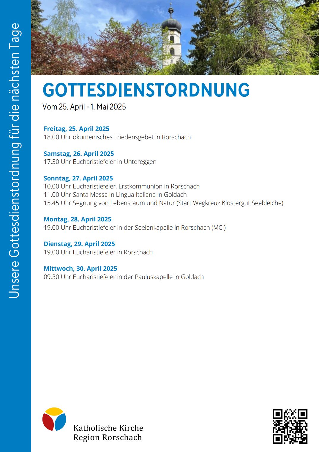 Gottesdienstordnung der KKRR für die nächsten TageThemen:Kath. RorschachKulturPartnerRegionRorschach 25. April 2025 - 05:20Gilt ab heute Freitag bis kommenden Mittwoch, 30. April 2025. Mehr Informationen finden Interessierte immer auch hier und hier.Teilen mit: Klicken, um einem Freund einen Link per E-Mail zu senden (Wird in neuem Fenster geöffnet) E-Mail Klicken zum Ausdrucken (Wird in neuem Fenster geöffnet) Drucken Klick, um auf Facebook zu teilen (Wird in neuem Fenster geöffnet) Facebook Klicke, um auf X zu teilen (Wird in neuem Fenster geöffnet) X Klicken, um auf WhatsApp zu teilen (Wird in neuem Fenster geöffnet) WhatsApp Gefällt mir:Gefällt mir Wird geladen …Newsletter abonnieren Bitte dieses Feld leer lassenBitte wähle, ob Du über jeden neuen Beitrag sofort oder lieber jeden Morgen gegen 9 Uhr eine Zusammenfassung der neusten Beiträge erhalten möchtest.Liste(n) auswählen: Neues vom Echo (Zusammenfassung) Neues vom Echo (Sofortbenachrichtigung) Dieses Feld wird benötigt.Prüfen Sie Ihren Posteingang und den Spamordner, um Ihr Abonnement zu bestätigen.