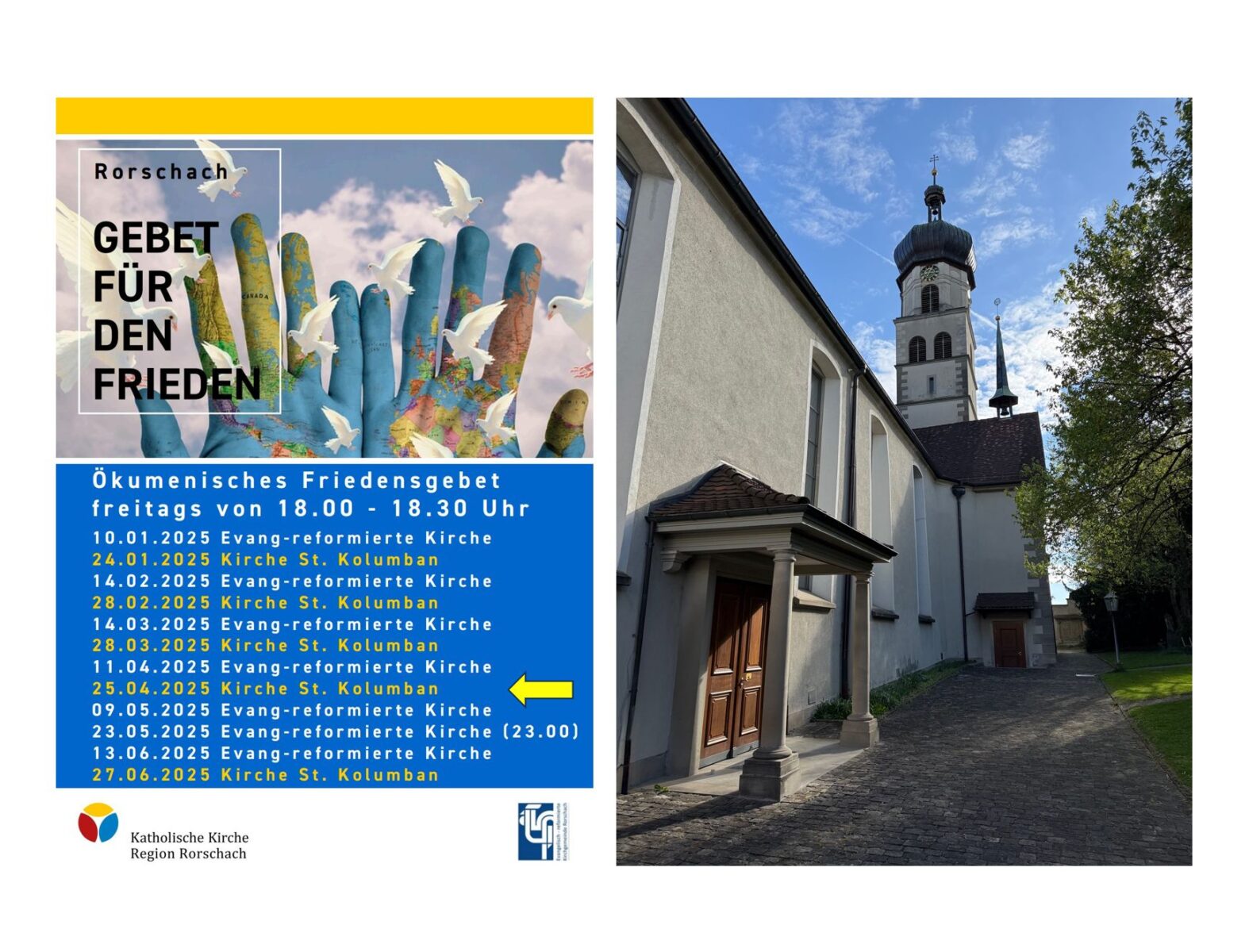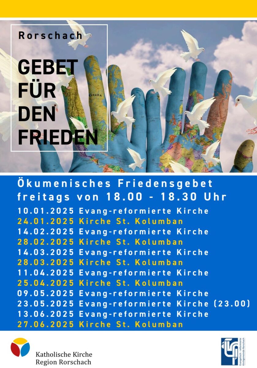 Heute wird in Rorschach wieder für den Frieden gebetetThemen:Kath. RorschachKulturPartnerRef. RorschachRorschach 25. April 2025 - 05:10Das ökumenische Friedensgebet findet ab 18 Uhr in der Kolumbanskirche statt. Mehr Infos dazu finden Interessierte auch hier.Teilen mit: Einen Link per E-Mail an einen Freund senden (Wird in neuem Fenster geöffnet) E-Mail Drucken (Wird in neuem Fenster geöffnet) Drucken Auf Facebook teilen (Wird in neuem Fenster geöffnet) Facebook Auf X teilen (Wird in neuem Fenster geöffnet) X Auf WhatsApp teilen (Wird in neuem Fenster geöffnet) WhatsApp Gefällt mir:Gefällt mir Wird geladen …Newsletter abonnieren Bitte dieses Feld leer lassenBitte wähle, ob Du über jeden neuen Beitrag sofort oder lieber jeden Morgen gegen 9 Uhr eine Zusammenfassung der neusten Beiträge erhalten möchtest.Liste(n) auswählen: Neues vom Echo (Zusammenfassung) Neues vom Echo (Sofortbenachrichtigung) Dieses Feld wird benötigt.Prüfen Sie Ihren Posteingang und den Spamordner, um Ihr Abonnement zu bestätigen.