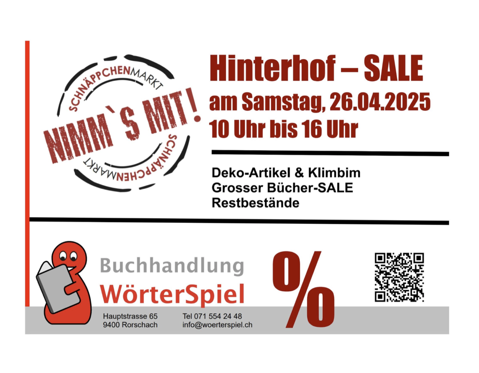 Für einmal ist nicht nur die Buchhandlung attraktiv, sondern auch der Hinterhof… Ab 10 Uhr kommen hier die Schnäppchenjäger voll auf ihre Kosten!
