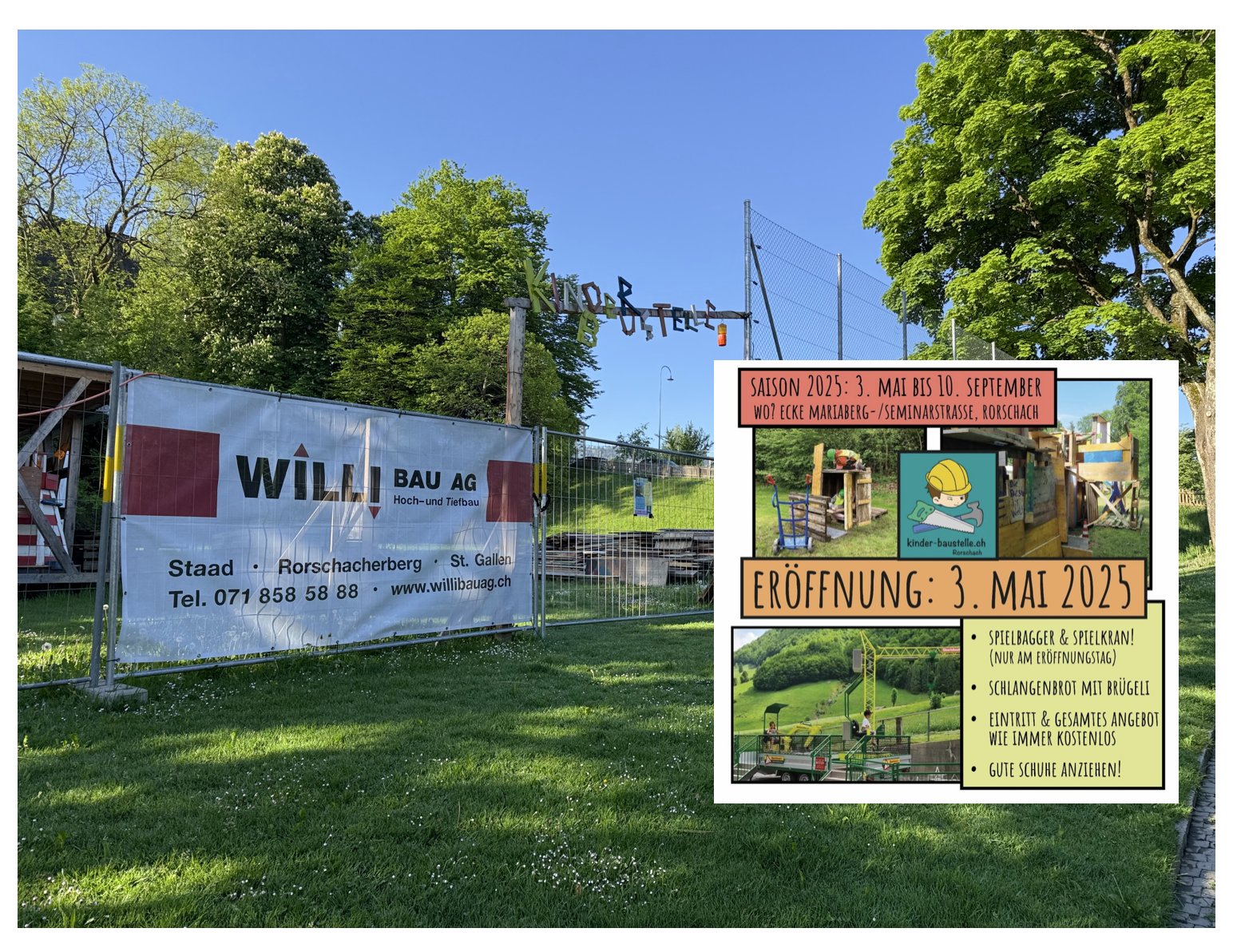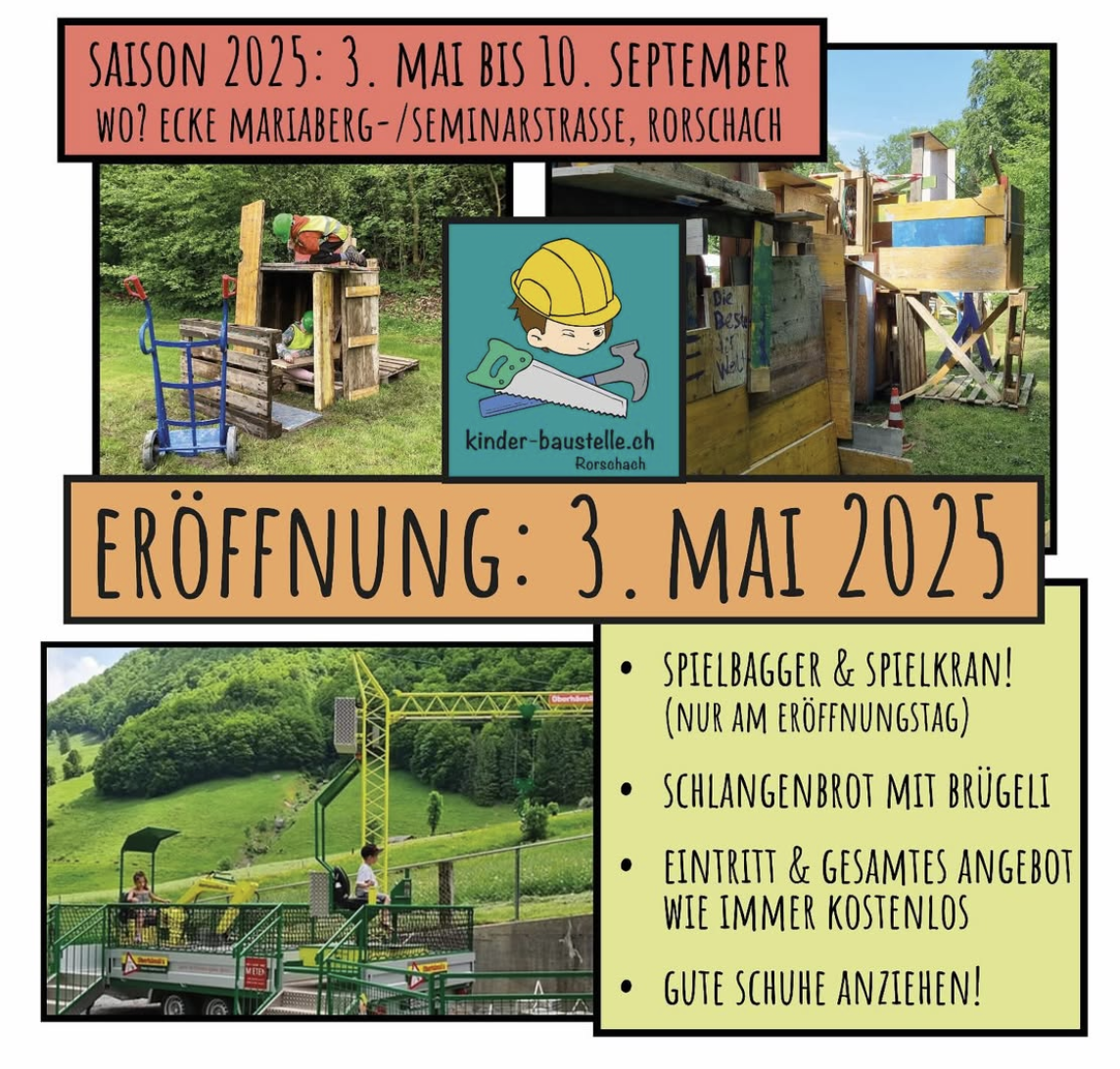 Heute startet die Rorschacher Kinder-BaustelleThemen:Kinderbaustelle 2025KulturRorschach 3. Mai 2025 - 05:30Mehr rund um dieses wunderbare Kinderprojekt findet man hier, hier und hier.Teilen mit: Einen Link per E-Mail an einen Freund senden (Wird in neuem Fenster geöffnet) E-Mail Drucken (Wird in neuem Fenster geöffnet) Drucken Auf Facebook teilen (Wird in neuem Fenster geöffnet) Facebook Auf X teilen (Wird in neuem Fenster geöffnet) X Auf WhatsApp teilen (Wird in neuem Fenster geöffnet) WhatsApp Gefällt mir:Gefällt mir Wird geladen …Newsletter abonnieren Bitte dieses Feld leer lassenBitte wähle, ob Du über jeden neuen Beitrag sofort oder lieber jeden Morgen gegen 9 Uhr eine Zusammenfassung der neusten Beiträge erhalten möchtest.Liste(n) auswählen: Neues vom Echo (Zusammenfassung) Neues vom Echo (Sofortbenachrichtigung) Dieses Feld wird benötigt.Prüfen Sie Ihren Posteingang und den Spamordner, um Ihr Abonnement zu bestätigen.