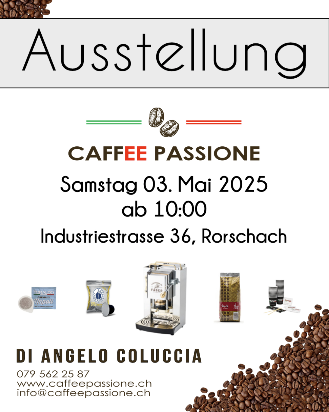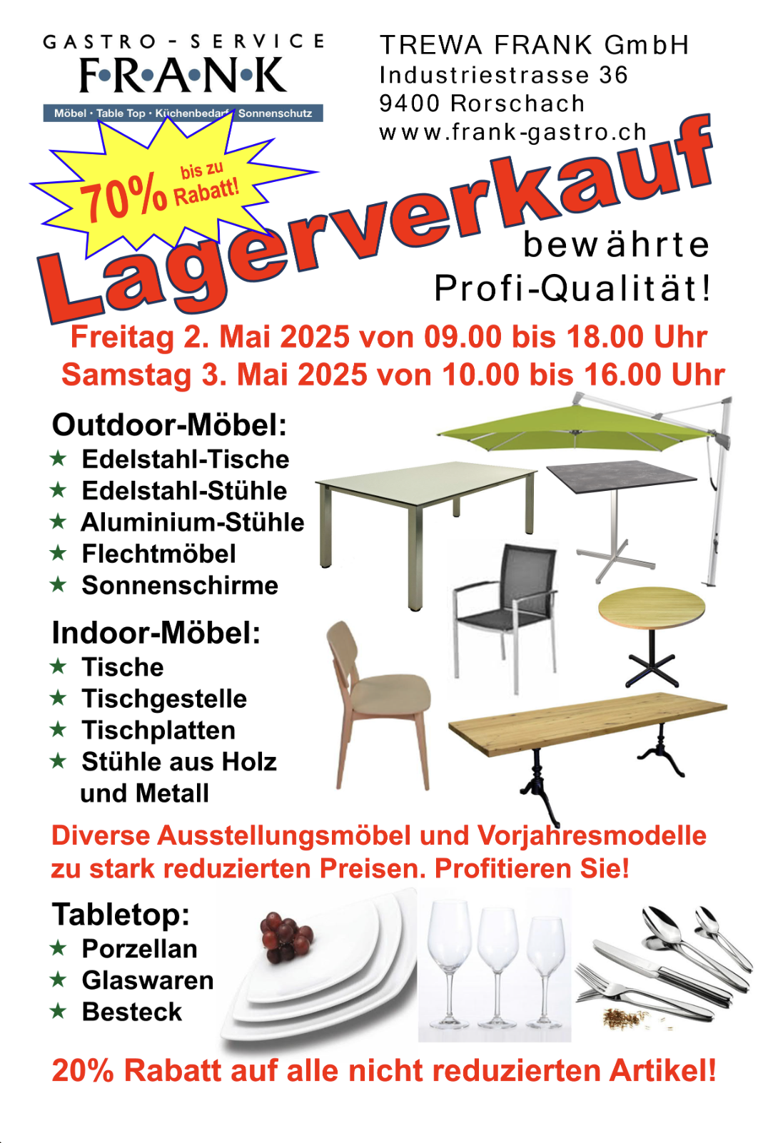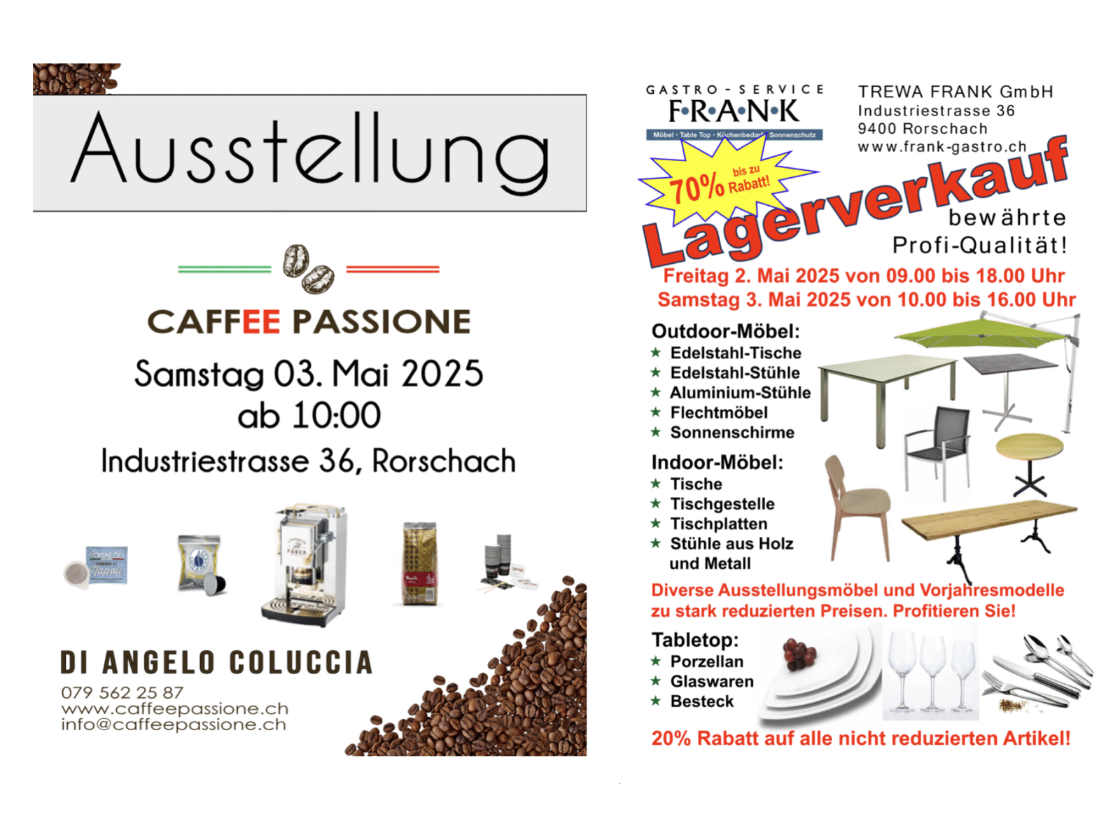 Letzter Tag Lagerverkauf an der Industriestrasse 36Themen:Rorschach 3. Mai 2025 - 05:20Heute Samstag von 10 bis 16 Uhr bei der Trewa Frank GmbH in Rorschach – und erst noch mit viel Kaffeeduft. Teilen mit: Einen Link per E-Mail an einen Freund senden (Wird in neuem Fenster geöffnet) E-Mail Drucken (Wird in neuem Fenster geöffnet) Drucken Auf Facebook teilen (Wird in neuem Fenster geöffnet) Facebook Auf X teilen (Wird in neuem Fenster geöffnet) X Auf WhatsApp teilen (Wird in neuem Fenster geöffnet) WhatsApp Gefällt mir:Gefällt mir Wird geladen …Newsletter abonnieren Bitte dieses Feld leer lassenBitte wähle, ob Du über jeden neuen Beitrag sofort oder lieber jeden Morgen gegen 9 Uhr eine Zusammenfassung der neusten Beiträge erhalten möchtest.Liste(n) auswählen: Neues vom Echo (Zusammenfassung) Neues vom Echo (Sofortbenachrichtigung) Dieses Feld wird benötigt.Prüfen Sie Ihren Posteingang und den Spamordner, um Ihr Abonnement zu bestätigen.