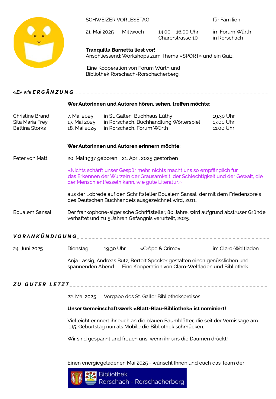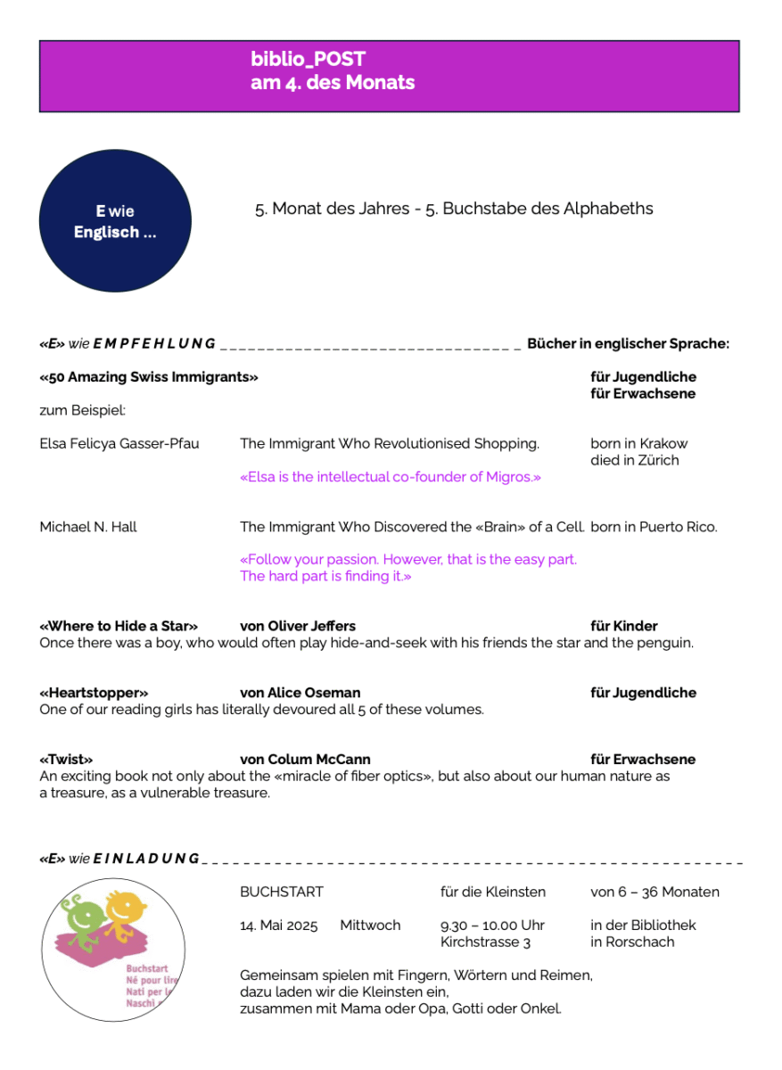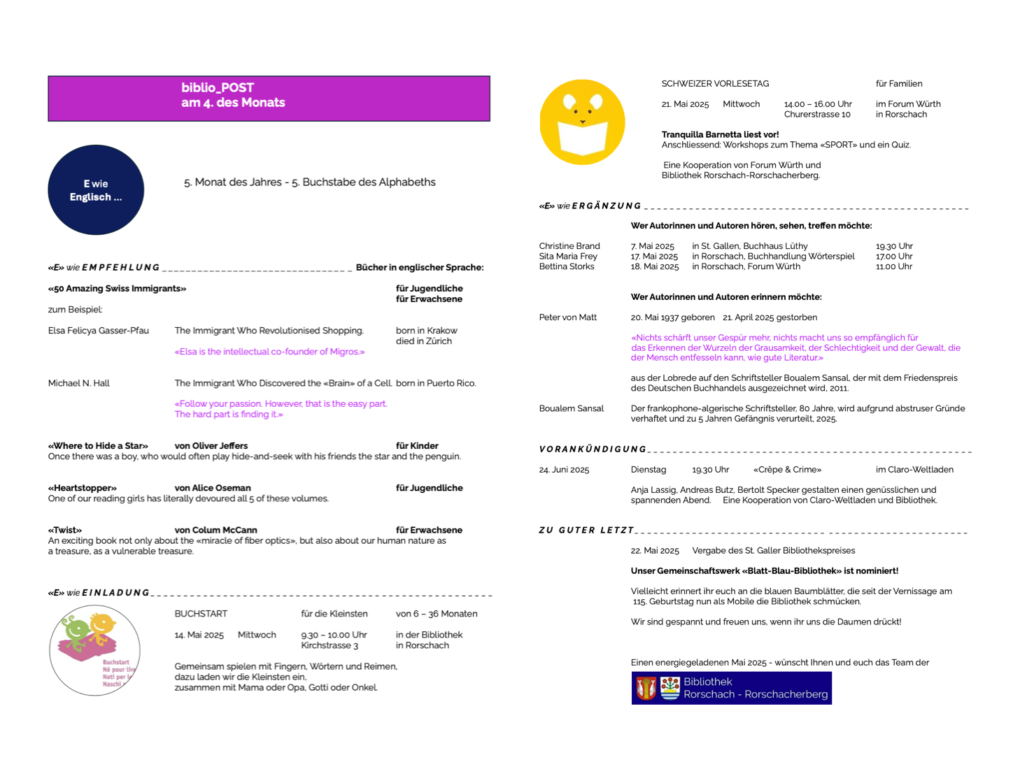 Der 5. Monat des Jahres ist dem 5. Buchstaben im Alphabet gewidmet. Alle Informationen findet man auf den Infoblättern unten. Mehr rund um unsere Bibliothek findet man auch hier.