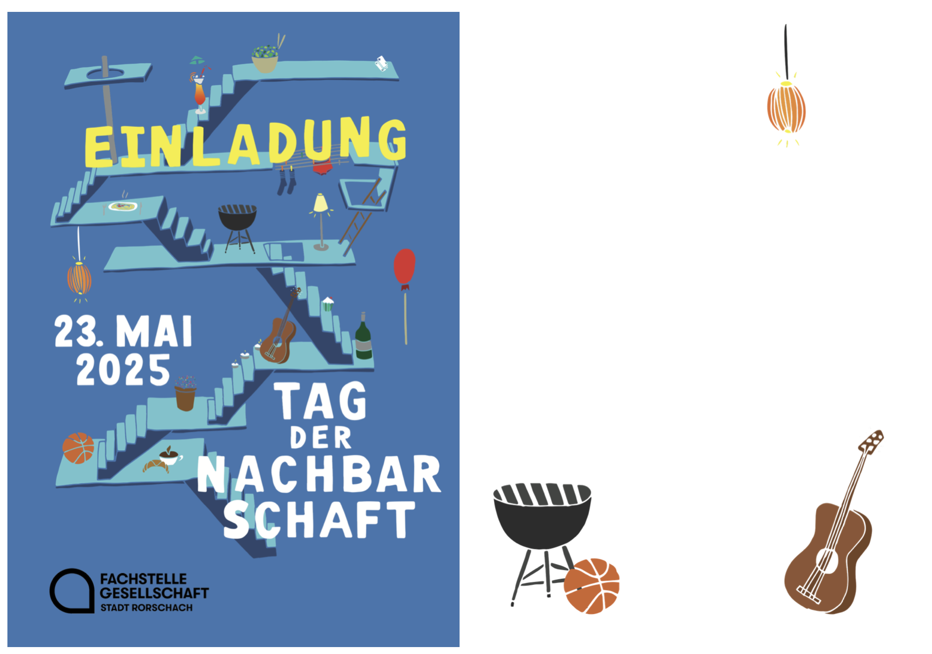 „Haben Sie Lust als Privatperson oder auch als Organisation ein Projekt zu starten? Machen Sie mit! Das Plakat und die Einladungskarten können auch in gedruckter Form bei uns in der Fachstelle Gesellschaft, an der Feldmühlestrasse 26, während den Öffnungszeiten (Montag 14-18 Uhr, Mittwoch & Donnerstag 9-12 Uhr) abgeholt werden. Falls Sie Fragen haben oder bei der Realisierung Ihrer Ideen Unterstützung benötigen, sind wir gerne für Sie da! Wir freuen uns auf einen lebendigen und bunten Tag der Nachbarschaft in der Stadt Rorschach. Wenn Sie Lust haben, dann senden Sie uns ein Foto von Ihrem Nachbarschafts-Anlass auf fsgs@rorschach.ch oder 079 691 69 22.“