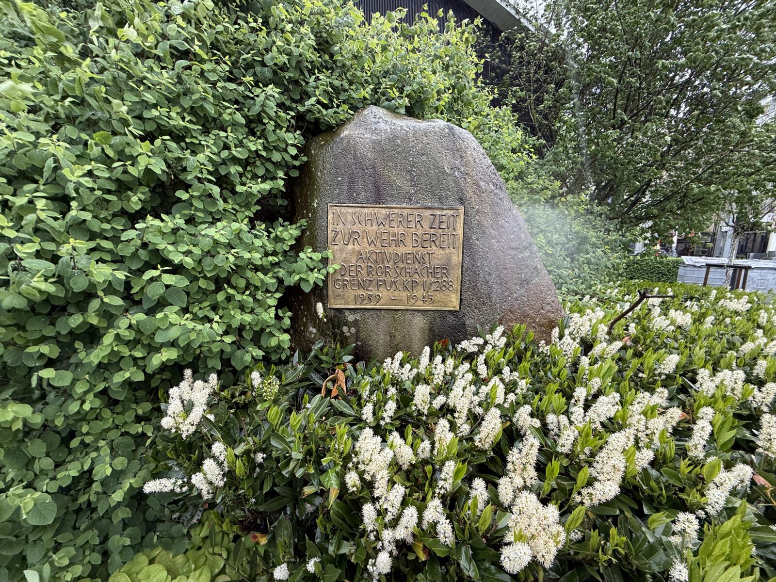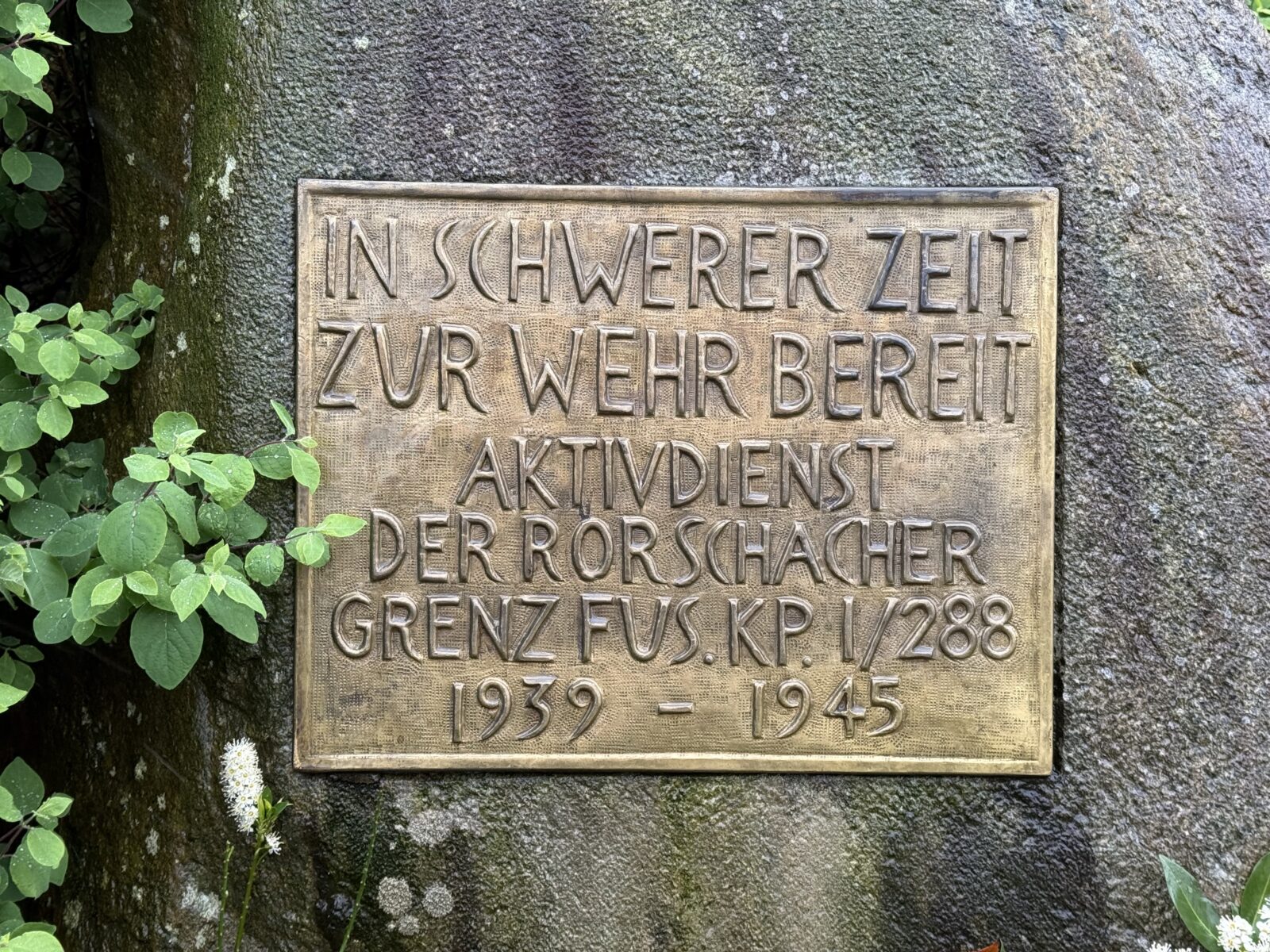Vor 80 Jahren endete in Europa der 2. Weltkrieg. Die Gedenktafel beim Pavillon erinnert an den Aktivdienst der Rorschacher Grenz Füsilier-Kompanie 1/288. Bleibt zu hoffen, dass wir in der aktuellen Weltlage aus der Geschichte die richtigen Lehren ziehen.