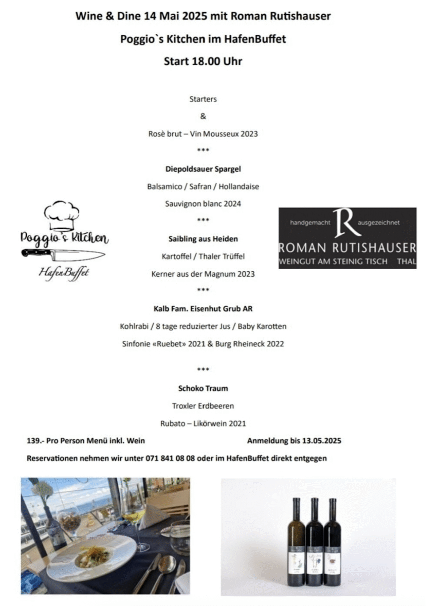 HafenBuffet lädt am 14. Mai 2025 zu Wine & DineThemen:BeizenKulturRorschach 7. Mai 2025 - 05:10Mehr Informationen rund um diesen Event findet man auch hier und hier.Teilen mit: Einen Link per E-Mail an einen Freund senden (Wird in neuem Fenster geöffnet) E-Mail Drucken (Wird in neuem Fenster geöffnet) Drucken Auf Facebook teilen (Wird in neuem Fenster geöffnet) Facebook Auf X teilen (Wird in neuem Fenster geöffnet) X Auf WhatsApp teilen (Wird in neuem Fenster geöffnet) WhatsApp Gefällt mir:Gefällt mir Wird geladen …Newsletter abonnieren Bitte dieses Feld leer lassenBitte wähle, ob Du über jeden neuen Beitrag sofort oder lieber jeden Morgen gegen 9 Uhr eine Zusammenfassung der neusten Beiträge erhalten möchtest.Liste(n) auswählen: Neues vom Echo (Zusammenfassung) Neues vom Echo (Sofortbenachrichtigung) Dieses Feld wird benötigt.Prüfen Sie Ihren Posteingang und den Spamordner, um Ihr Abonnement zu bestätigen.