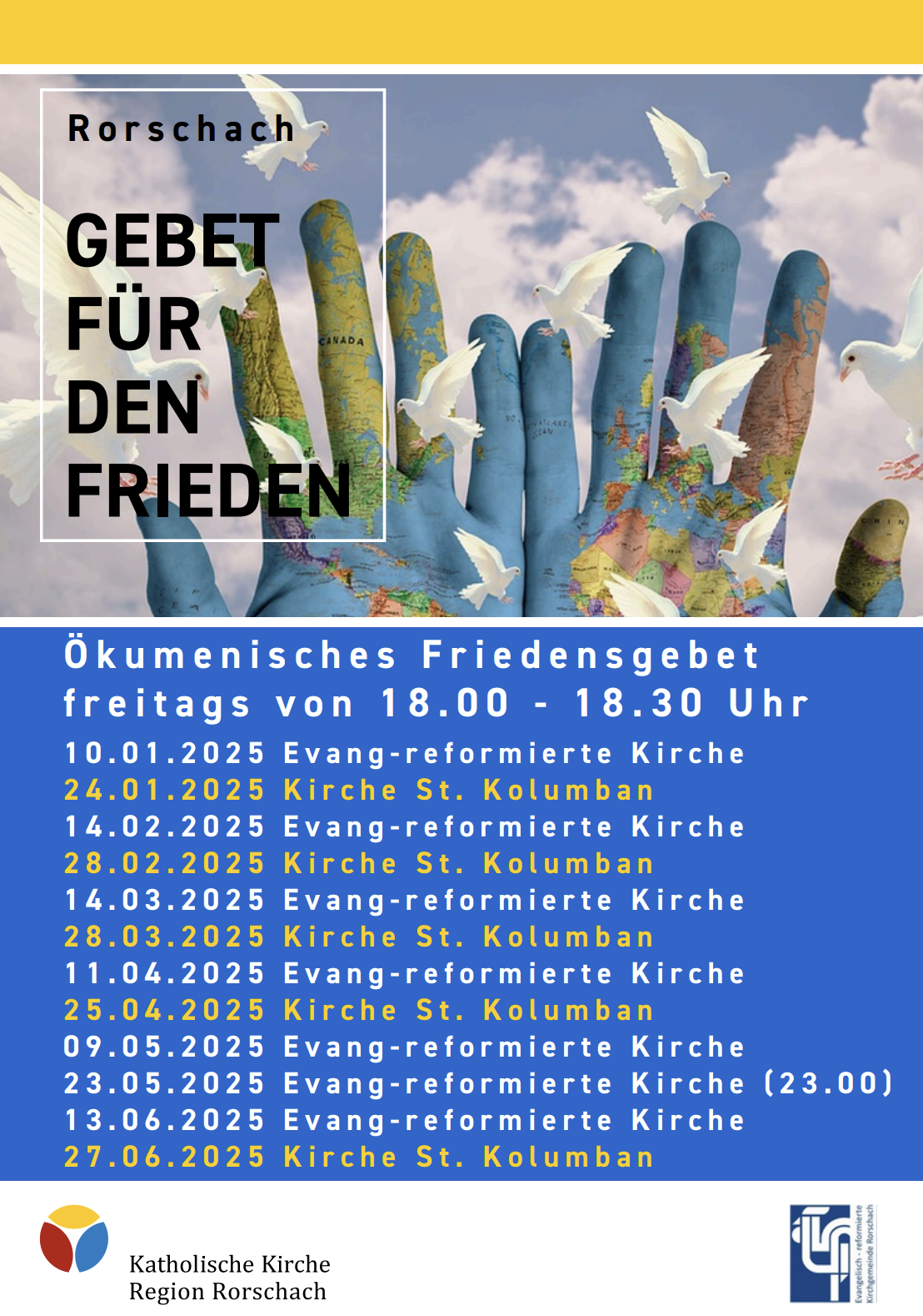 Heute wird in Rorschach wieder für den Frieden gebetetThemen:Kath. RorschachKulturPartnerRef. RorschachRorschach 9. Mai 2025 - 05:10Ab 18 Uhr in der Evangelischen Kirche in Rorschach. (Bild: pd refr)Teilen mit: Einen Link per E-Mail an einen Freund senden (Wird in neuem Fenster geöffnet) E-Mail Drucken (Wird in neuem Fenster geöffnet) Drucken Auf Facebook teilen (Wird in neuem Fenster geöffnet) Facebook Auf X teilen (Wird in neuem Fenster geöffnet) X Auf WhatsApp teilen (Wird in neuem Fenster geöffnet) WhatsApp Gefällt mir:Gefällt mir Wird geladen …Newsletter abonnieren Bitte dieses Feld leer lassenBitte wähle, ob Du über jeden neuen Beitrag sofort oder lieber jeden Morgen gegen 9 Uhr eine Zusammenfassung der neusten Beiträge erhalten möchtest.Liste(n) auswählen: Neues vom Echo (Zusammenfassung) Neues vom Echo (Sofortbenachrichtigung) Dieses Feld wird benötigt.Prüfen Sie Ihren Posteingang und den Spamordner, um Ihr Abonnement zu bestätigen.
