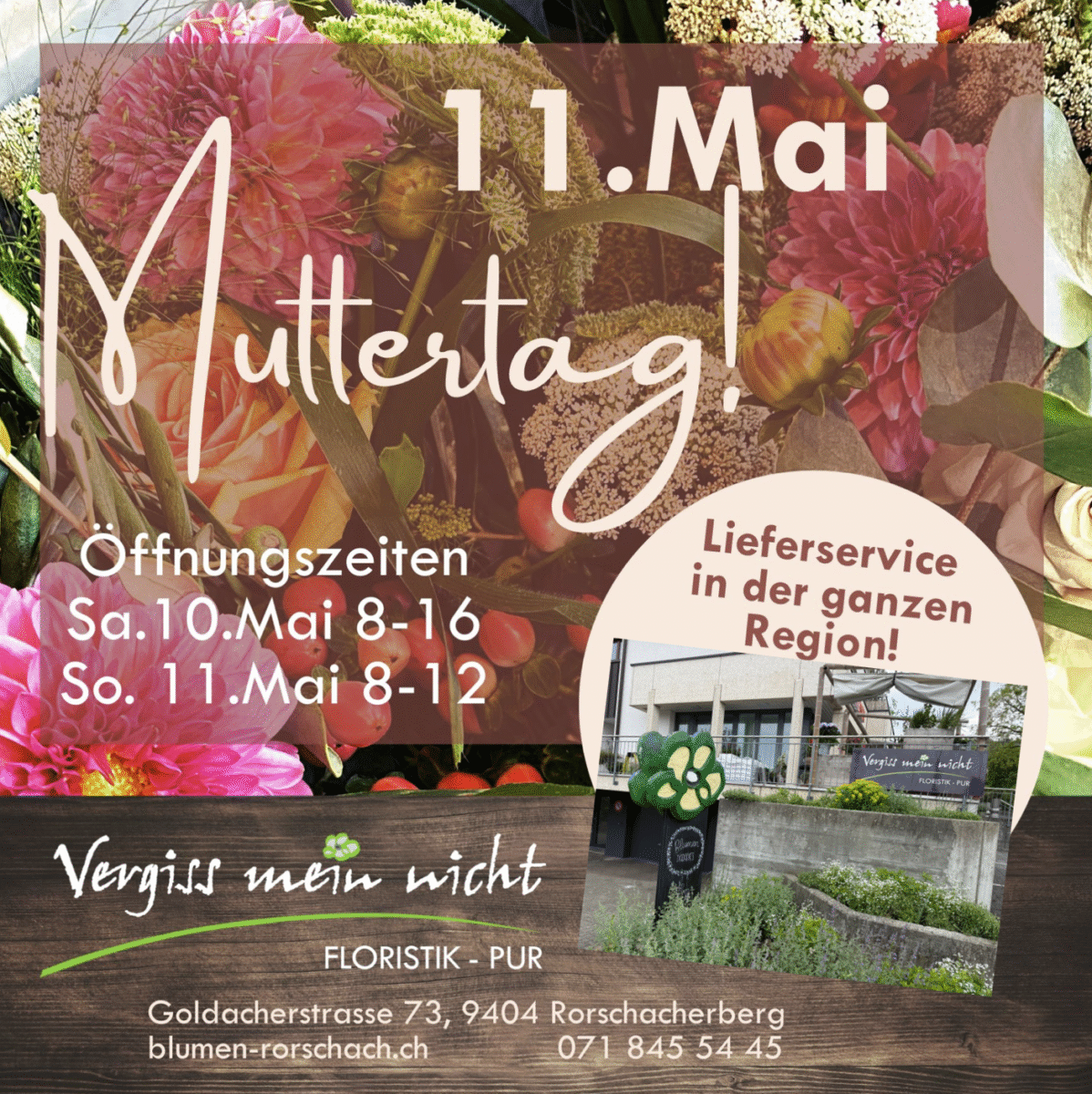 Der 2. Sonntag im Mai ist den Müttern dieser Welt gewidmet. Traditionell gehört auch dazu, die Mütter mit einem Blumenstrauss oder einem Geschenk zu beglücken. Eine grosse Auswahl hat Corine Hirzel in ihrem Blumenladen „Vergiss mein nicht“ an der Goldacherstrasse 27 in Rorschacherberg anzubieten. Heute Freitag ist das Geschäft von 8 bis 12 und 13.30 bis 18.30 offen, morgen Samstag von 8 bis 16 Uhr. Und dann am Muttertag selber von 8 bis 12 Uhr. Corina Hirzel bietet auch eine Lieferservice in der Region an. Das sieht dann so aus: