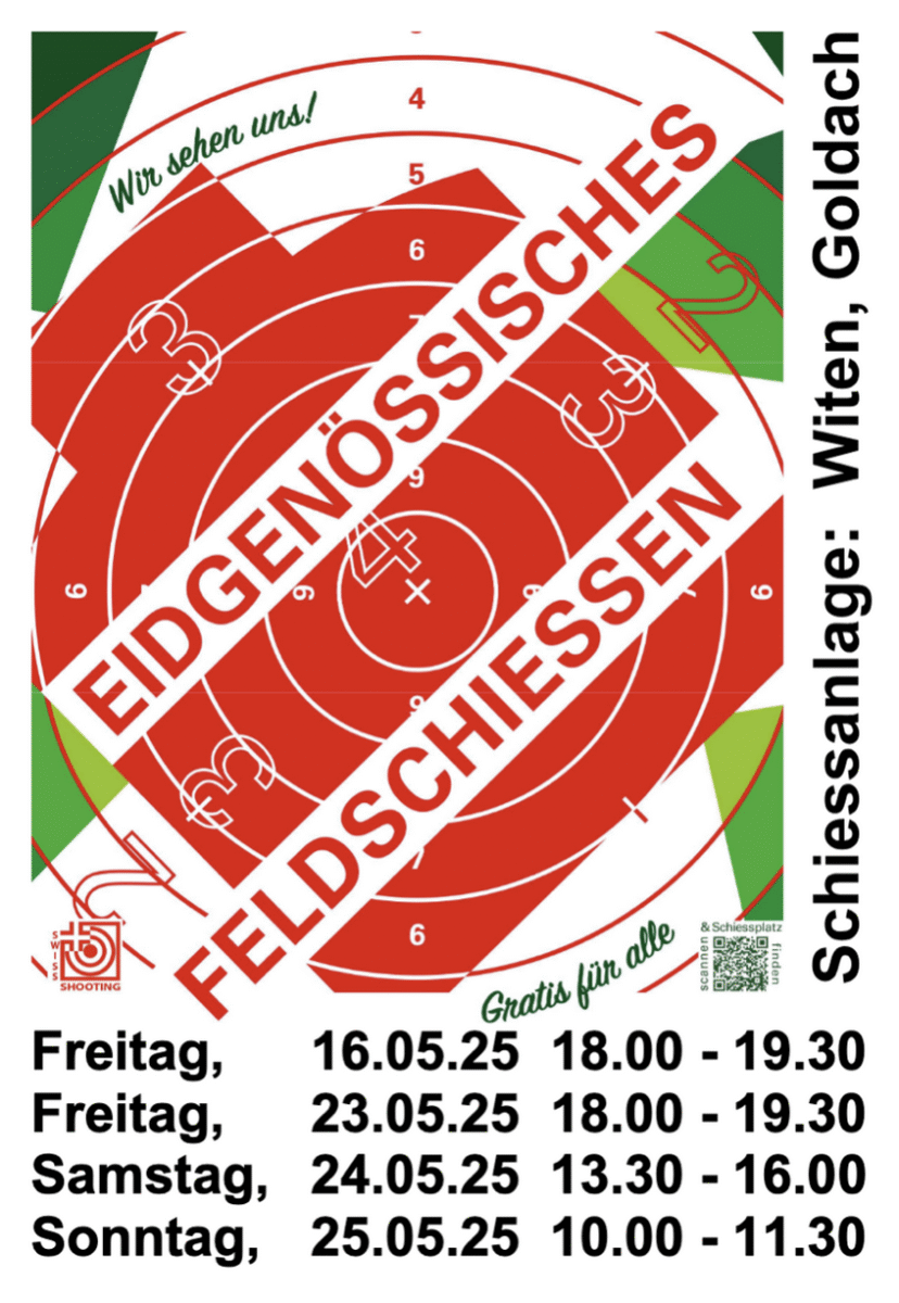 An diesem Wochenende wieder in der Schiessanlage Witen in Goldach. Die Zeiten findet man auf dem Flyer unten. Die Initianten schreiben: „Helfen sie mit, dass es mit dem grössten Schützenfest der Welt auch so bleibt. Teilnehmen können alle Schweizer ab 10 Jahren bis… Sie werden auf Wunsch von erfahrenen Schützenmeistern betreut. Geschossen wird auf 300m Gewehr und 50/25m Pistole. In der Schützenstube „Schützenlaube“ begrüsst sie die Familie Laub für Speis und Trank.“ Mehr Infos dazu findet man auch hier.