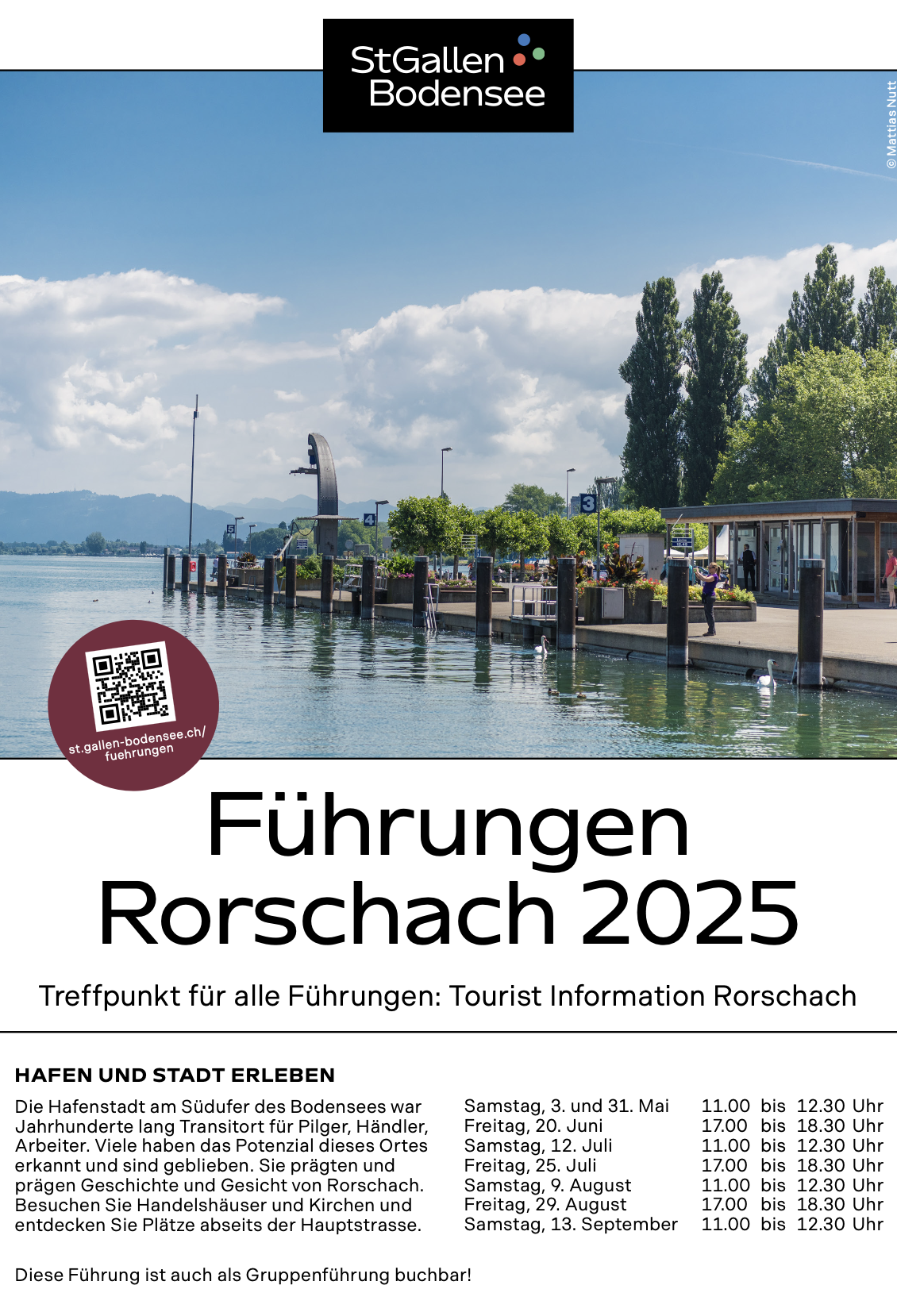 Rorschach, die faszinierende Hafenstadt am Südufer des Bodensees, beeindruckt mit einer reichen Geschichte und einzigartiger Atmosphäre. Historische Handelsplätze und eine malerische Uferpromenade prägen das Stadtbild. Die Stadtführung bietet Einblicke in bedeutende Orte und versteckte Ecken. (Text/PLakat: pd sbt)