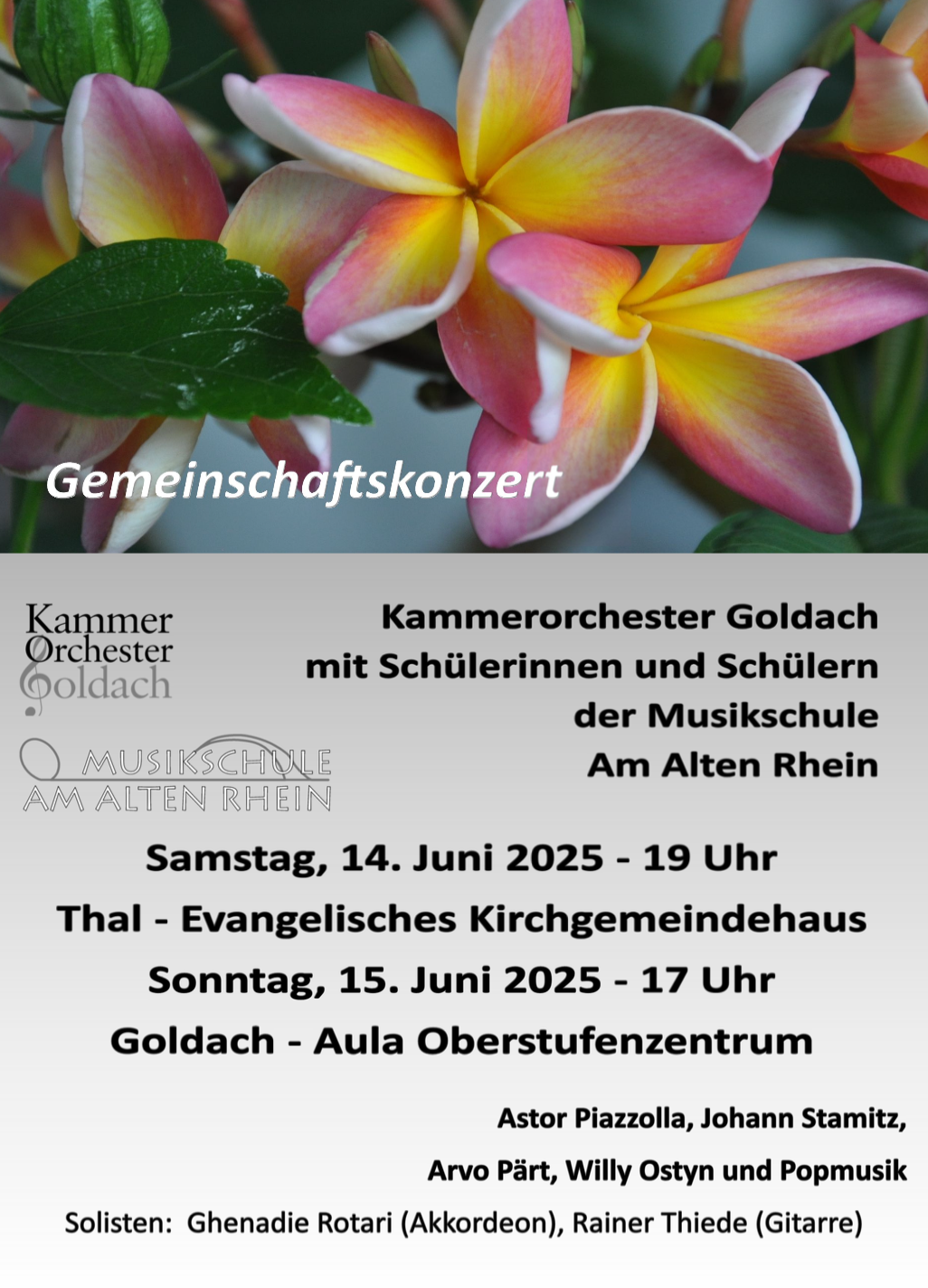 Musikschüler*innen und Lehrpersonen der Musikschule Am Alten Rhein musizieren gemeinsam mit dem Kammerorchester Goldach in zwei spannenden Konzerten in Thal und Goldach. Im Zentrum des Programms steht das mitreissende Konzert für Akkordeon, Gitarre und Orchester von Astor Piazzolla mit seinem südamerikanischen Flair. Die Soloparts übernehmen Ghenadie Rotari (Akkordeon) und Rainer Thiede (Gitarre).