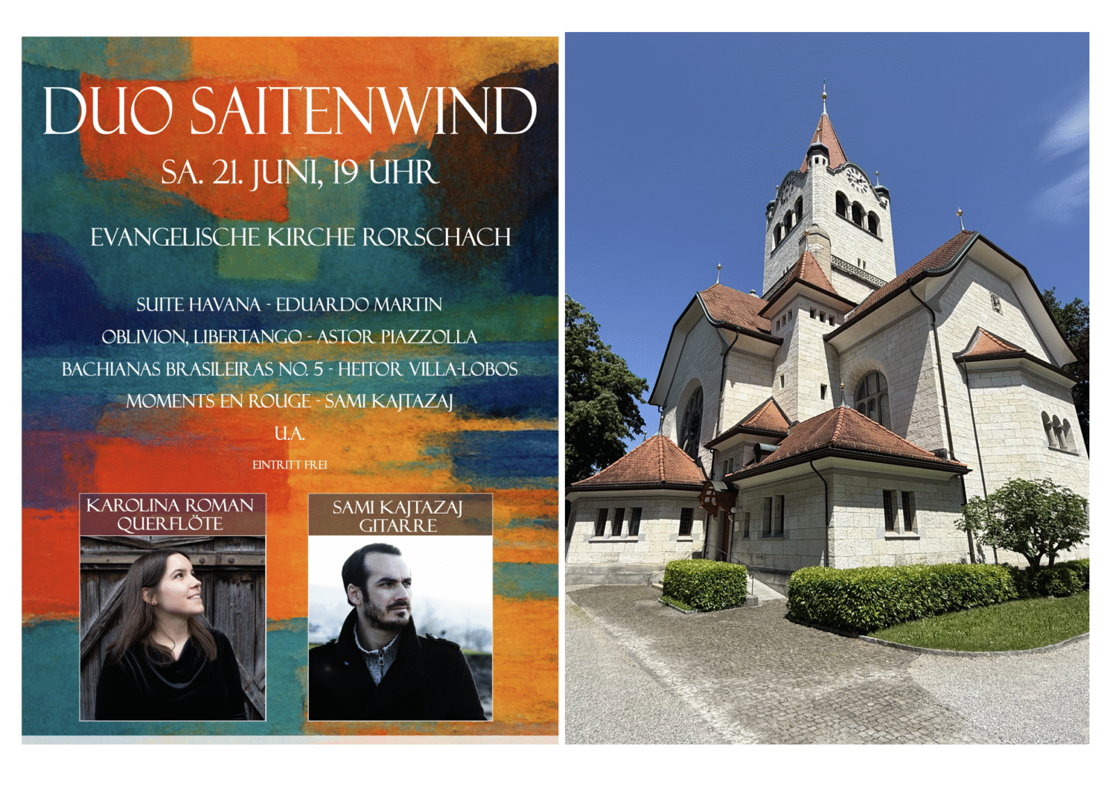 Vormerken: Das junge Duo Saitenwind mit Karolina Roman (Querflöte) und Sami Kajtazaj (Gitarre) überzeugt seit seiner Gründung durch emotionales Spiel, Virtuosität und ein fein abgestimmtes Zusammenspiel. Ihr Repertoire vereint klassische und unterhaltende Musik – von Piazzolla bis Di Marino – und bewegt sich mühelos zwischen südamerikanischen Rhythmen, klangvollen Melodien und ernster Kammermusik. Das Konzert findet am Samstag, 21. Juni 2025, um 19 Uhr in der Evengelischen Kirche in Rorschach statt.