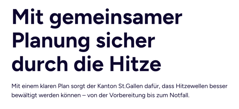 Der Kanton St.Gallen engagiert sich gemeinsam mit zahlreichen Partnern für den Schutz der Bevölkerung vor den gesundheitlichen Auswirkungen von Hitze. Der kantonale Hitzeaktionsplan hilft dabei, besonders gefährdete Personen besser zu unterstützen, das Bewusstsein für die Risiken von Hitze zu stärken und die Vorbereitung auf Hitzewellen zu verbessern. Eine neue Plattform informiert die Bevölkerung und unterstützt Fachpersonen und Entscheidungsträger rund um Hitze und Gesundheit.