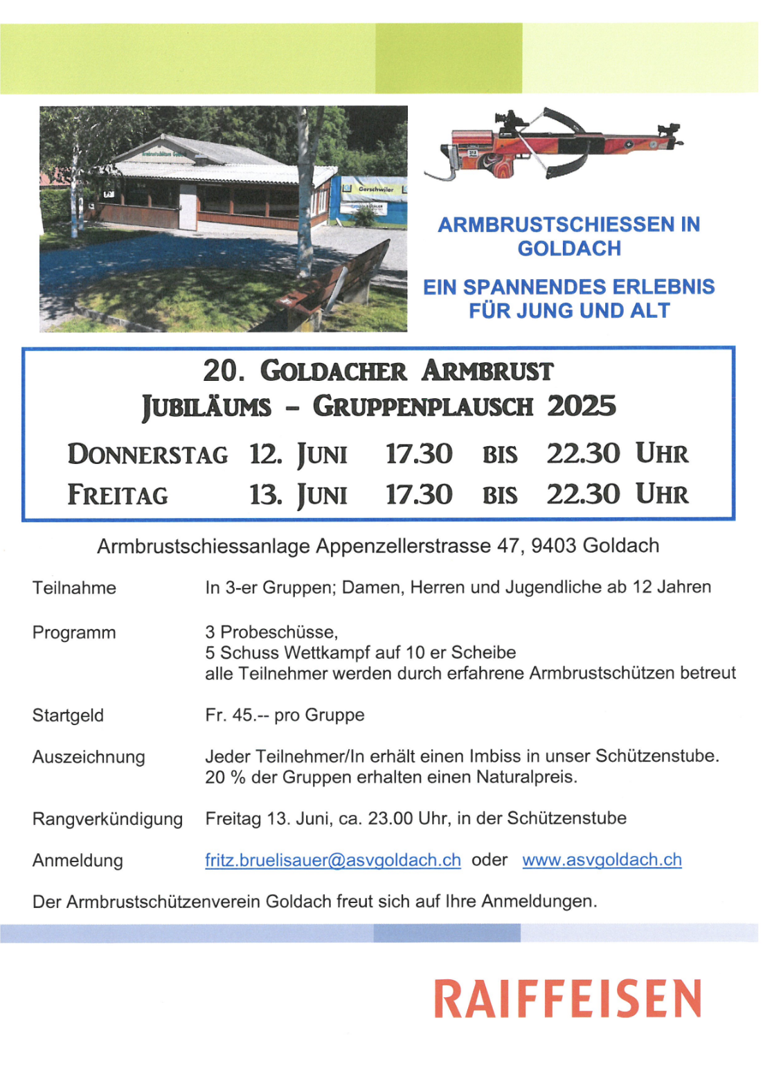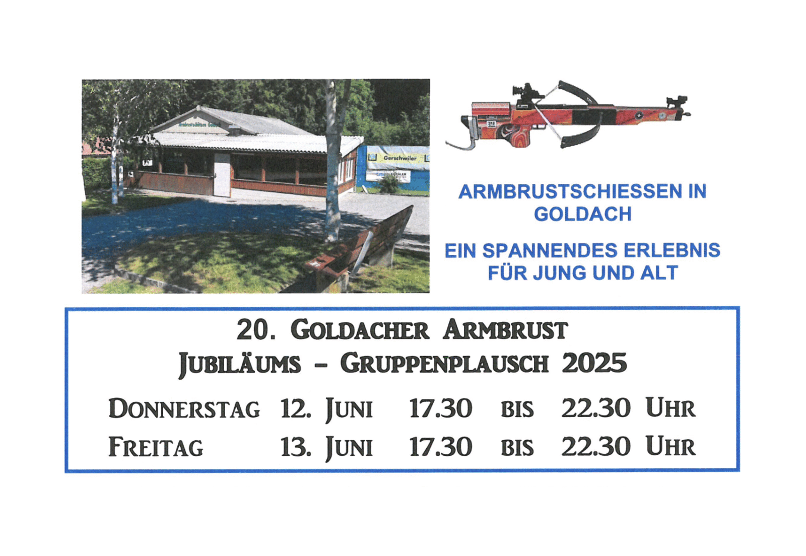 Dieser beliebte Anlass findet kommenden Donnerstag, 12. Juni 2025, und Freitag, 13. Juni 2025, statt. Mehr zu den Goldacher Armbrustschützen finden Interessierte hier.