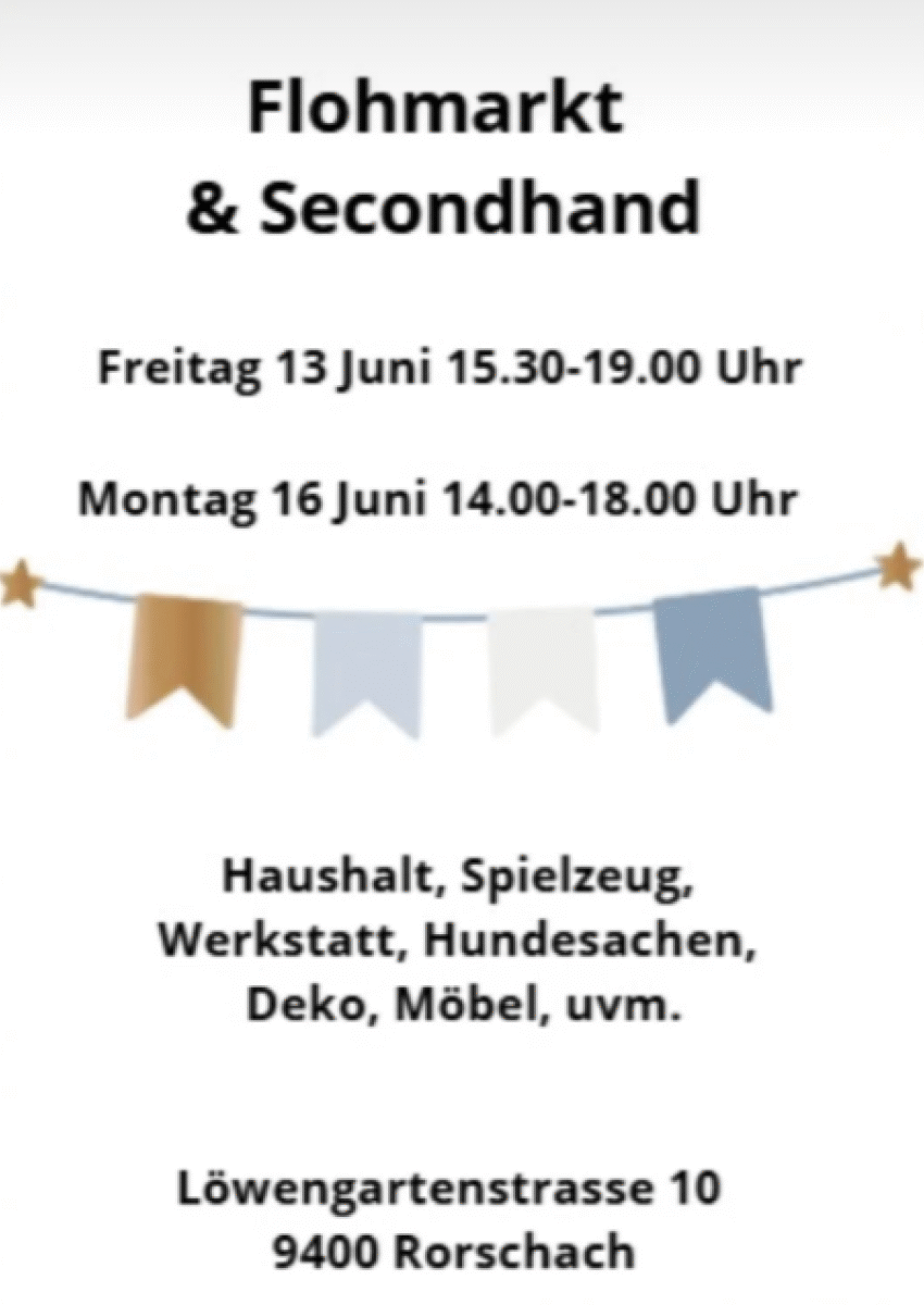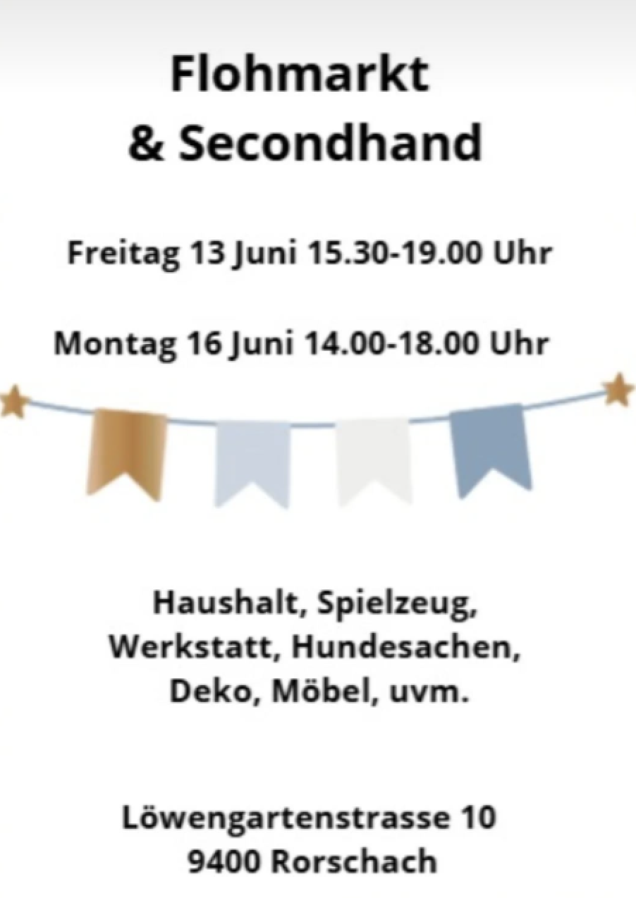 Das gibt es heute Freitag und am kommenden Montag: Kleiner aber feiner Floh & Secondhandmarkt. Heute Freitag, 13.06.2025 von 15.30 bis 19 Uhr, kommenden Montag, 16.06.2025 von 14 bis 18 Uhr. Einiges für Haushalt, Spielsachen, für die Werkstatt, Deko, Möbel, uvm.