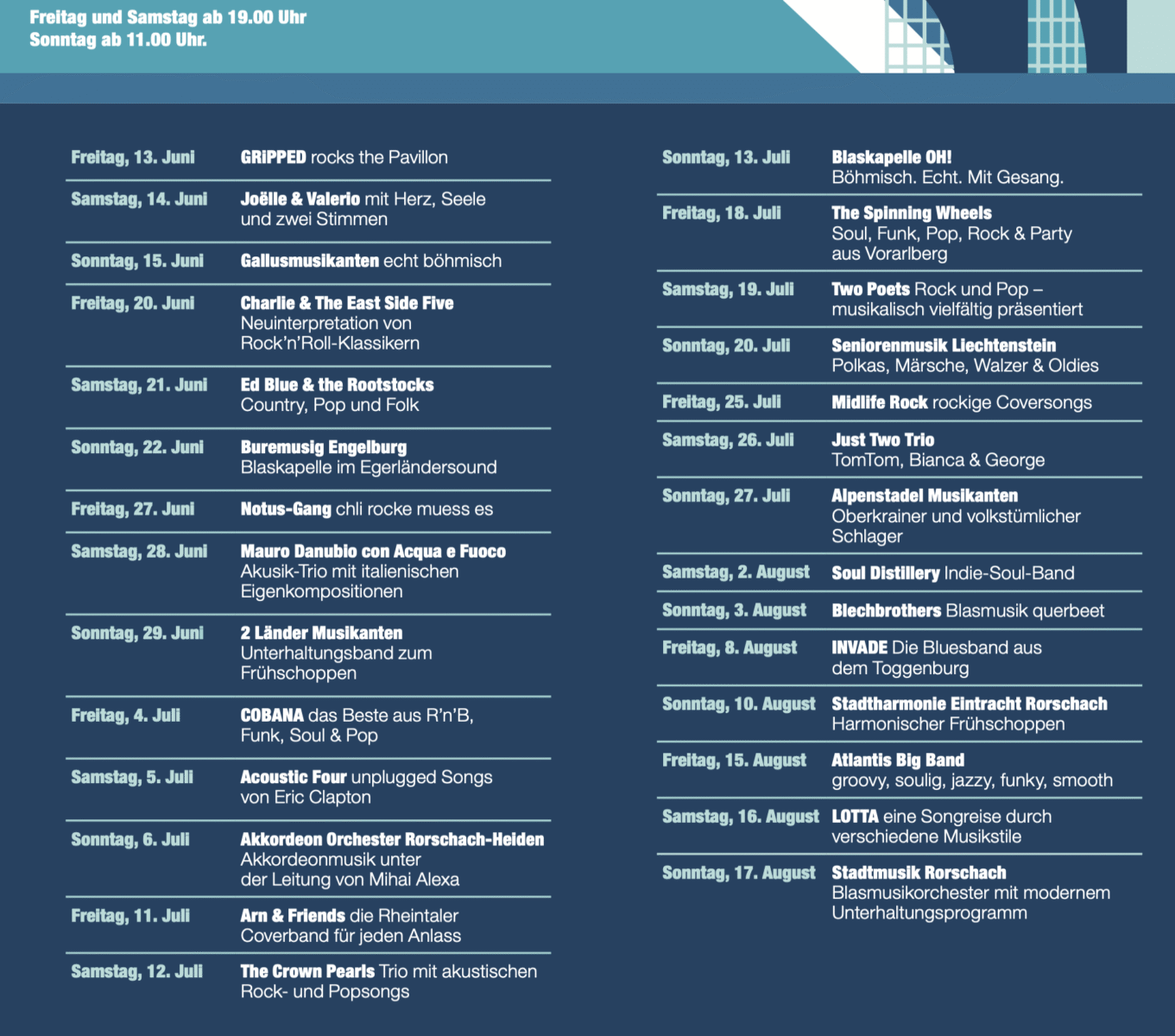Heute starten die beliebten Pavillon-KonzerteThemen:KulturPavillon am See 2025Rorschach 13. Juni 2025 - 05:35„Gripped“ werden heute ab 19 Uhr den Rorschacher Pavillon etwas aufrocken …Teilen mit: Einen Link per E-Mail an einen Freund senden (Wird in neuem Fenster geöffnet) E-Mail Drucken (Wird in neuem Fenster geöffnet) Drucken Auf Facebook teilen (Wird in neuem Fenster geöffnet) Facebook Auf X teilen (Wird in neuem Fenster geöffnet) X Auf WhatsApp teilen (Wird in neuem Fenster geöffnet) WhatsApp Gefällt mir:Gefällt mir Wird geladen …Newsletter abonnieren Bitte dieses Feld leer lassenBitte wähle, ob Du über jeden neuen Beitrag sofort oder lieber jeden Morgen gegen 9 Uhr eine Zusammenfassung der neusten Beiträge erhalten möchtest.Liste(n) auswählen: Neues vom Echo (Zusammenfassung) Neues vom Echo (Sofortbenachrichtigung) Dieses Feld wird benötigt.Prüfen Sie Ihren Posteingang und den Spamordner, um Ihr Abonnement zu bestätigen.