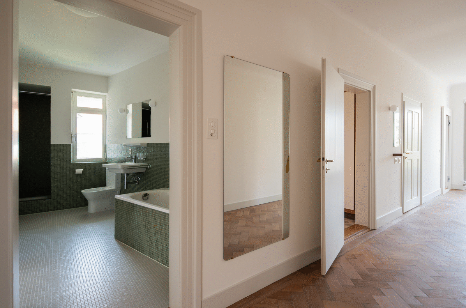 Die Erdgeschosswohnung ist dem Stil des Baujahres gewidmet: 1798. Die Verbundenheit mit der Geschichte des Hauses ist hier deutlich spürbar. Hier betrieb einst die bekannte Kaufmannsfamilie de Albertis ihre Handelsgeschäfte. Im ersten Stock leben die frühen 70er-Jahre in moderner Loft-Ausführung auf: Offene Räume mit eleganten Holzböden schaffen hier ein Wohlgefühl. Die Wohnung im zweiten Stock ist dem Jahr 1958 gewidmet. Der 50er-Jahre-Stil entfaltet sich in einer einzigartigen Raumaufteilung, zwei Balkone ergänzen den grosszügigen Wohnraum. Das Dachgeschoss schlägt den Bogen in die Moderne, hier wurde der Baustil des Jahres 2024 umgesetzt. Vier in alle Himmelsrichtungen ausgerichtete Mansarden bestimmen den Grundriss – eine davon ist komplett aus Glas.
