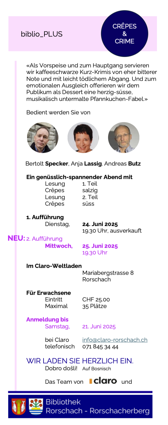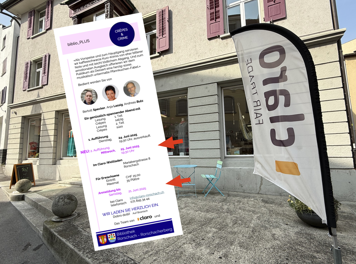 Der erster Anlass «Crêpes & Crime» am Dienstag, 24. Juni 2025, im claro-Weltladen in Rorschach ist bereits ausverkauft! Die Initiant:Innen haben jetzt am Folgetag gleich nochmals den gleichen Anlass angesagt. Anmeldeschluss für den 2. Anlass ist kommenden Samstag.