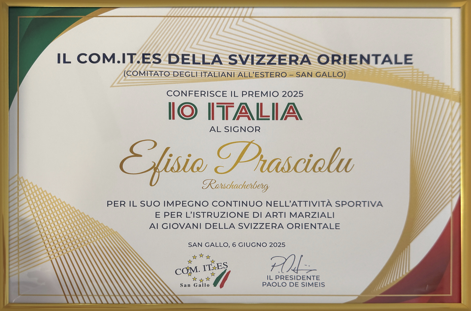 Einer der diesjährigen Preise ging an den Sarden Efisio Prasciolu der sich durch kontinuierliches Engagement im Bereich des Sports und der Unterrichtung in den Kampfkünsten besonders hervorgetan hat. Sein unermüdlicher Einsatz für die Förderung von Jugendlichen in der Ostschweiz wurde mit dieser Ehrung auf eindrucksvolle Weise anerkannt.